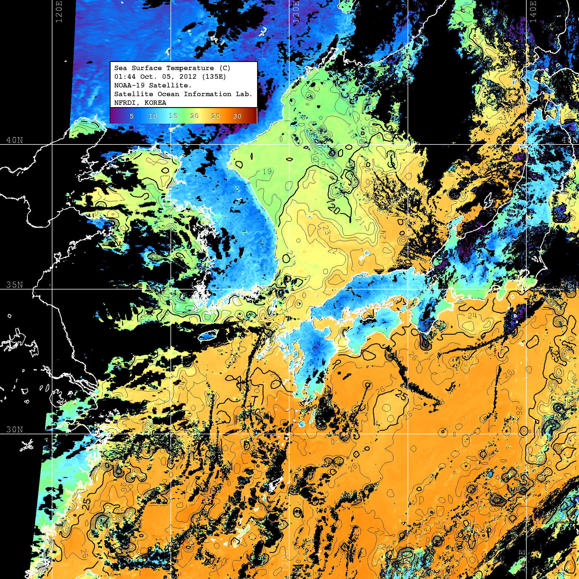 o 2012년 10월 05일 NOAA 위성영상입니다. o 영상 시간 및 수온분포는 범례를 참고하시기 바랍니다. o 검은색은 구름을 나타냅니다. o 그림을 클릭하시면 크게 보실 수 있습니다.