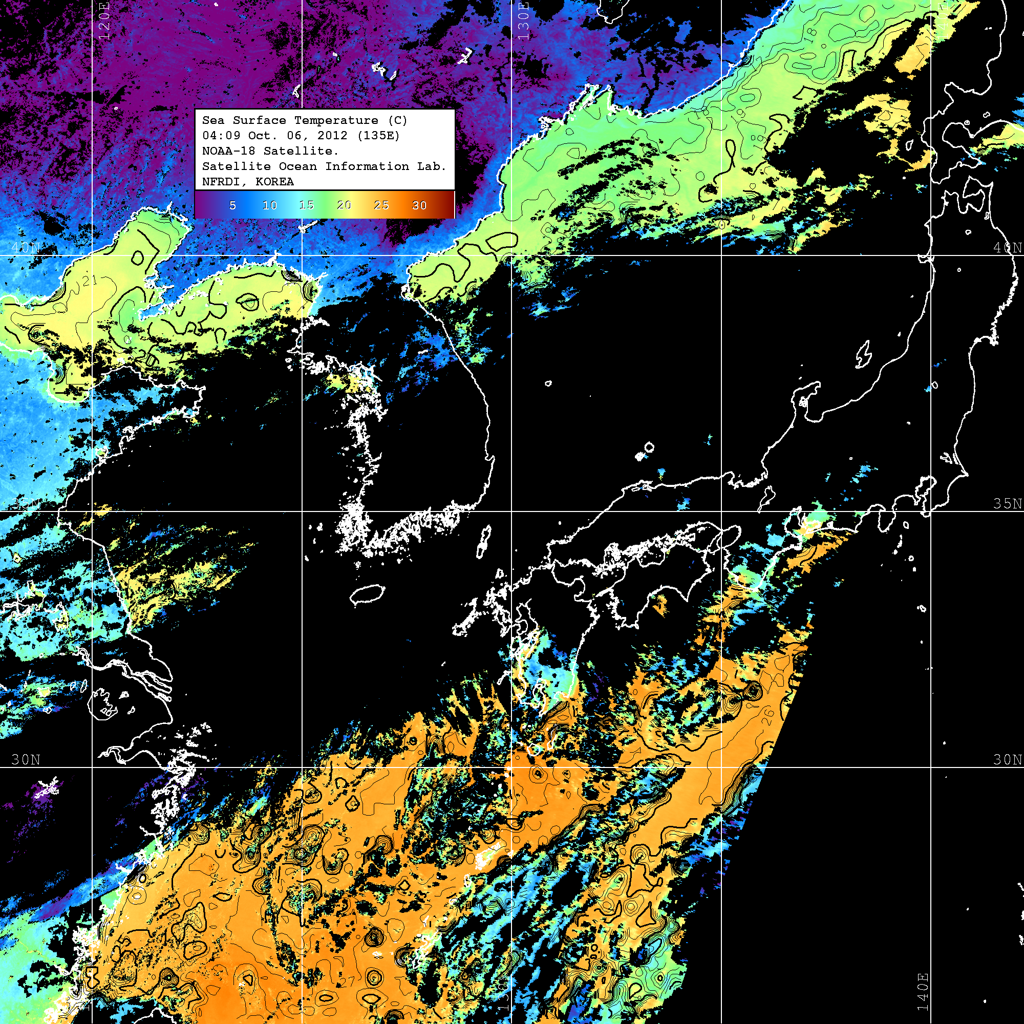 o 2012년 10월 06일 NOAA 위성영상입니다. o 영상 시간 및 수온분포는 범례를 참고하시기 바랍니다. o 검은색은 구름을 나타냅니다. o 그림을 클릭하시면 크게 보실 수 있습니다.