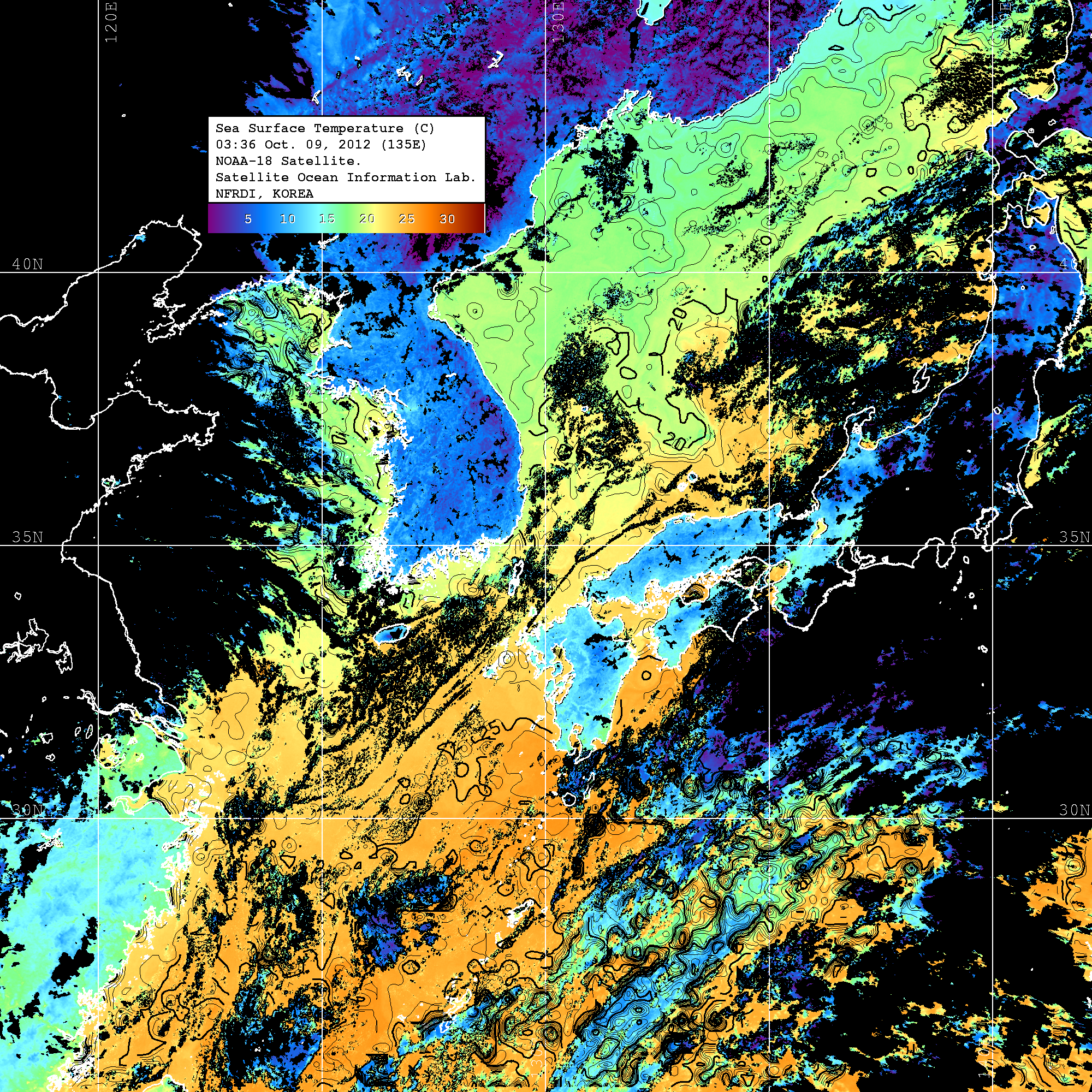 o 2012년 10월 09일 NOAA 위성영상입니다. o 영상 시간 및 수온분포는 범례를 참고하시기 바랍니다. o 검은색은 구름을 나타냅니다. o 그림을 클릭하시면 크게 보실 수 있습니다.