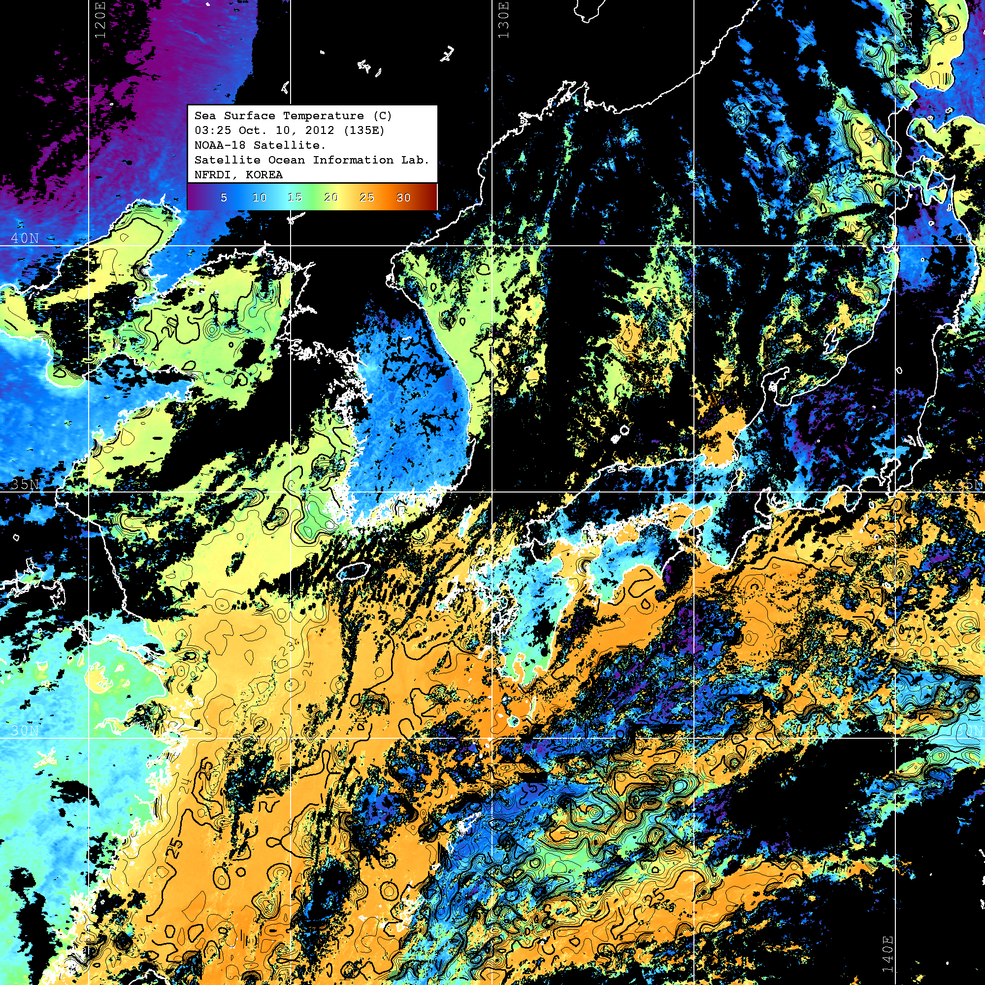 o 2012년 10월 10일 NOAA 위성영상입니다. o 영상 시간 및 수온분포는 범례를 참고하시기 바랍니다. o 검은색은 구름을 나타냅니다. o 그림을 클릭하시면 크게 보실 수 있습니다.