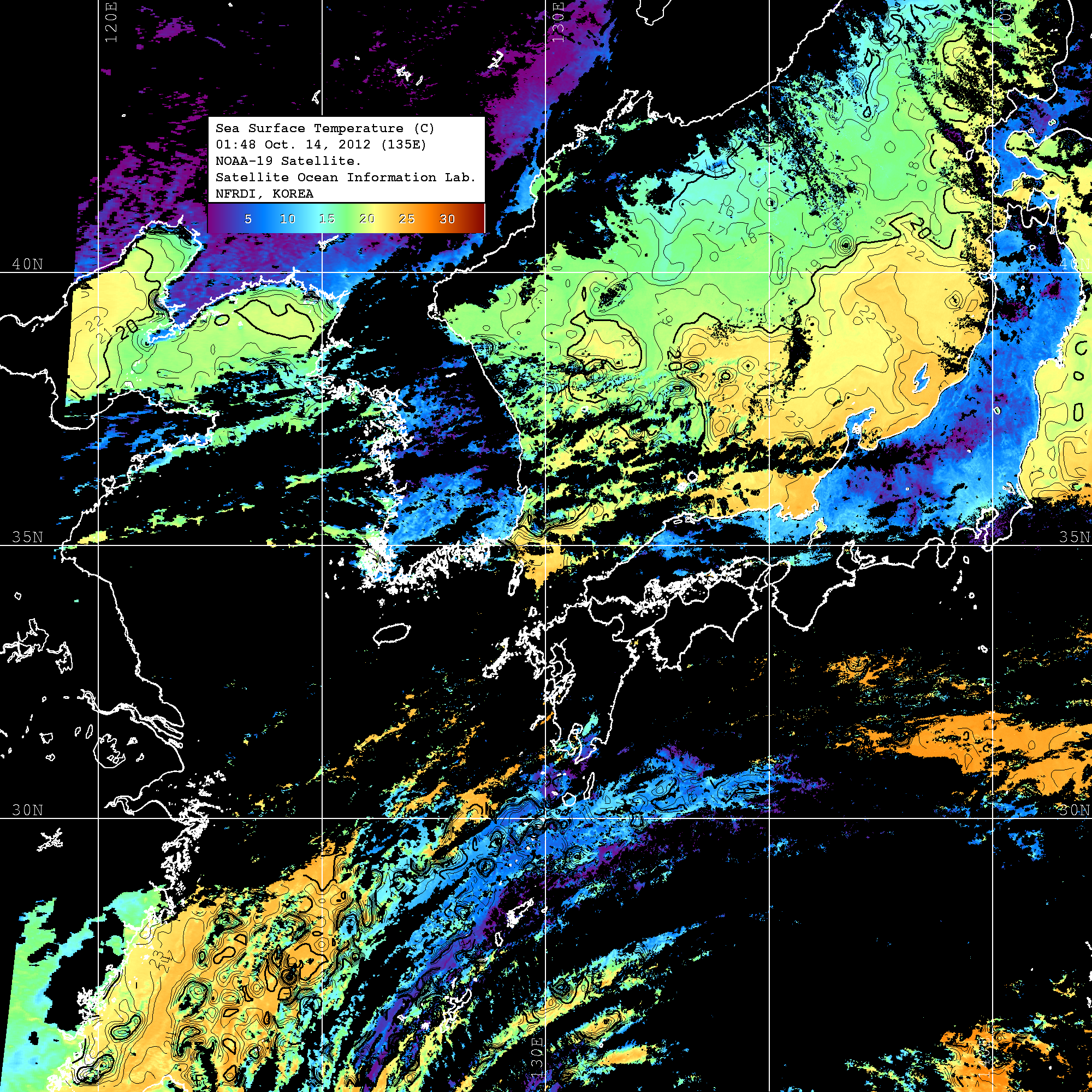 o 2012년 10월 14일 NOAA 위성영상입니다. o 영상 시간 및 수온분포는 범례를 참고하시기 바랍니다. o 검은색은 구름을 나타냅니다. o 그림을 클릭하시면 크게 보실 수 있습니다.