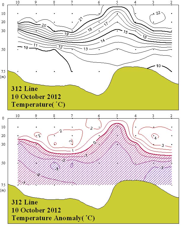 ㅇ 2012년 10월 10일 국립수산과학원 서해수산연구소에서 조사한 312선 (제주해협 서방)의 수직수온분포도 및 평년편차도입니다. ㅇ 15℃를 중심으로 수심 20~50m에서 수온약층이 나타났습니다. ㅇ 평년에 비하여 표층에서는 1~4℃범위의 고온현상을 보인 반면, 20m부터 저층까지 1~3℃범위의 저온현상을 보였습니다.