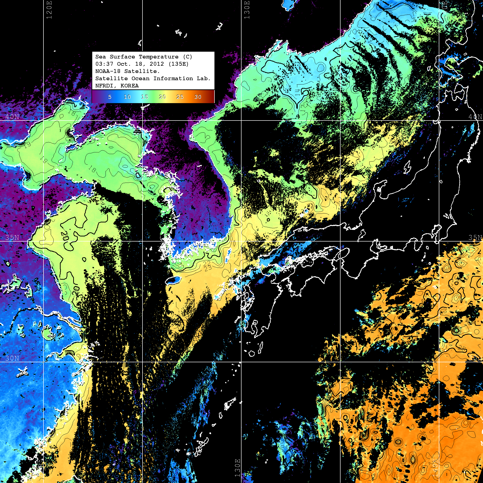 o 2012년 10월 18일 NOAA 위성영상입니다. o 영상 시간 및 수온분포는 범례를 참고하시기 바랍니다. o 검은색은 구름을 나타냅니다. o 그림을 클릭하시면 크게 보실 수 있습니다.