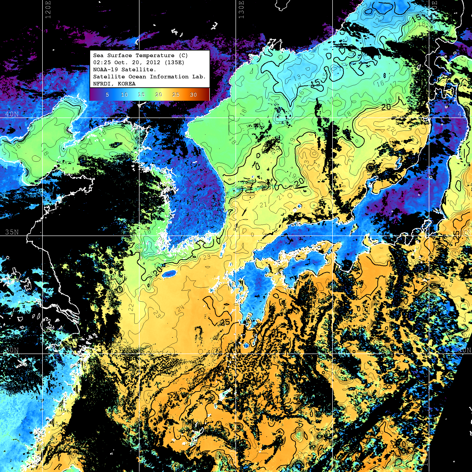 o 2012년 10월 20일 NOAA 위성영상입니다. o 영상 시간 및 수온분포는 범례를 참고하시기 바랍니다. o 검은색은 구름을 나타냅니다. o 그림을 클릭하시면 크게 보실 수 있습니다.