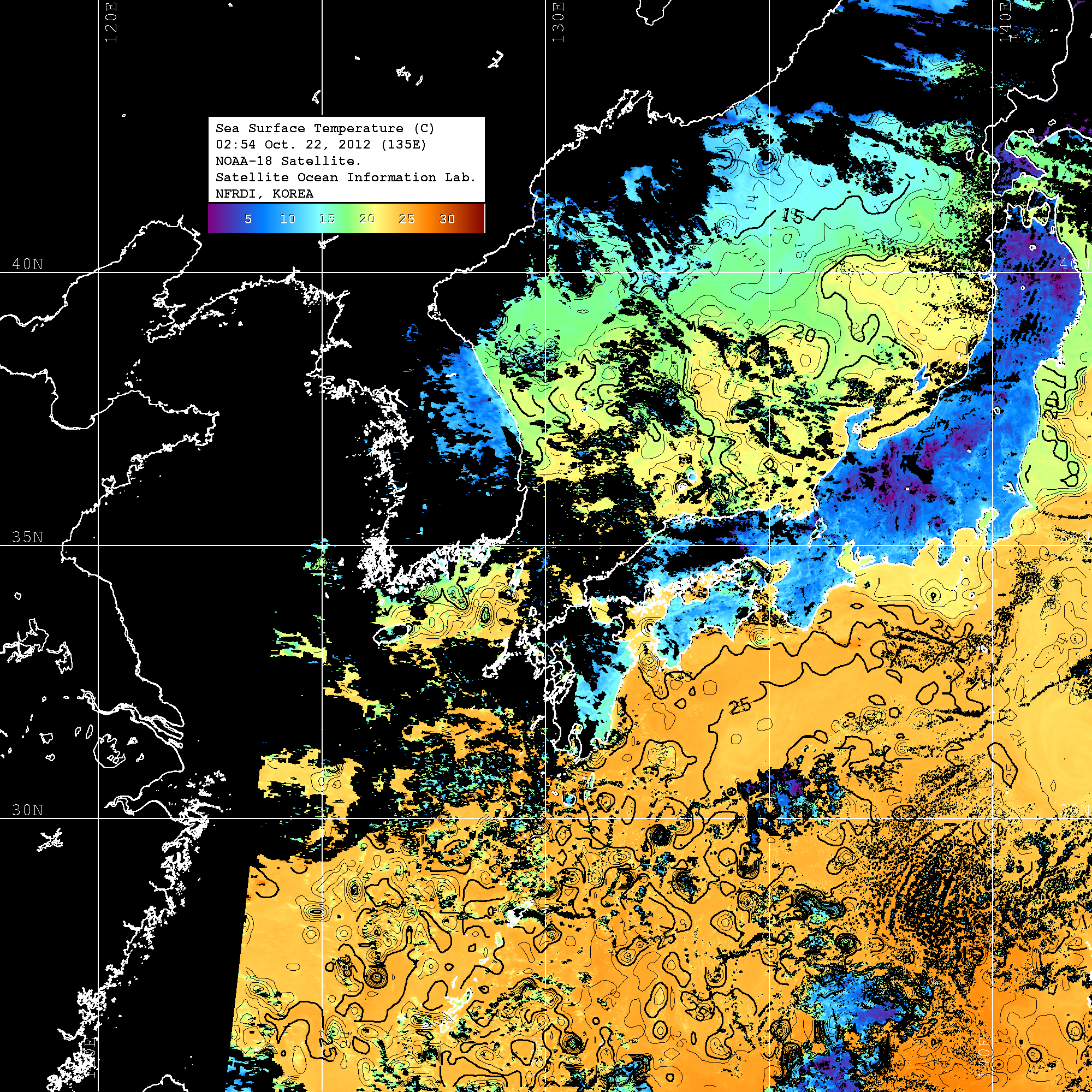 o 2012년 10월 22일 NOAA 위성영상입니다. o 영상 시간 및 수온분포는 범례를 참고하시기 바랍니다. o 검은색은 구름을 나타냅니다. o 그림을 클릭하시면 크게 보실 수 있습니다.