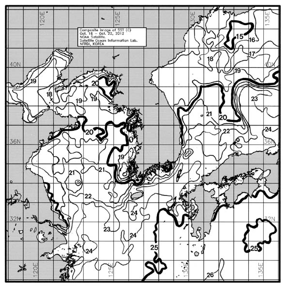 o 금주(2012.10.16~2012.10.22)의 한국근해 표면수온은 대화퇴 근해 19~20도, 울릉도-독도 근해 21~22도, 대마도 근해 23~24도, 제주도 근해 22~23도, 이어도 근해 22~23도, 가거초 근해 20~21도, 어청도 근해 19~20도, 백령도 근해 17∼18도로 나타납니다. o「평년에 비해」대화퇴 근해 0.3도 높게, 울릉도-독도 근해 비슷하게, 대마도 근해 0.6도 낮게, 제주도 근해 비슷하게, 이어도 근해 0.6도 낮게, 가거초 근해 0.8도 높게, 어청도 근해는 0.5도 높게 나타납니다. o「전년에 비해」대화퇴 근해 2도 높게, 울릉도-독도 근해 1도 높게, 대마도 근해 1도 낮게, 제주도 근해 1도 낮게, 이어도 근해 비슷하게, 가거초 근해 1.5도 높게, 어청도 근해는 2도 높게, 백령도 근해 2도 높게 나타납니다. o 수온 전선대는 우리나라 제주해협에서 대한해협까지 22도를 중심으로 형성됩니다. (http://www.nfrdi.re.kr/bbs?id=newfish) 에서도 이용하실 수 있습니다.