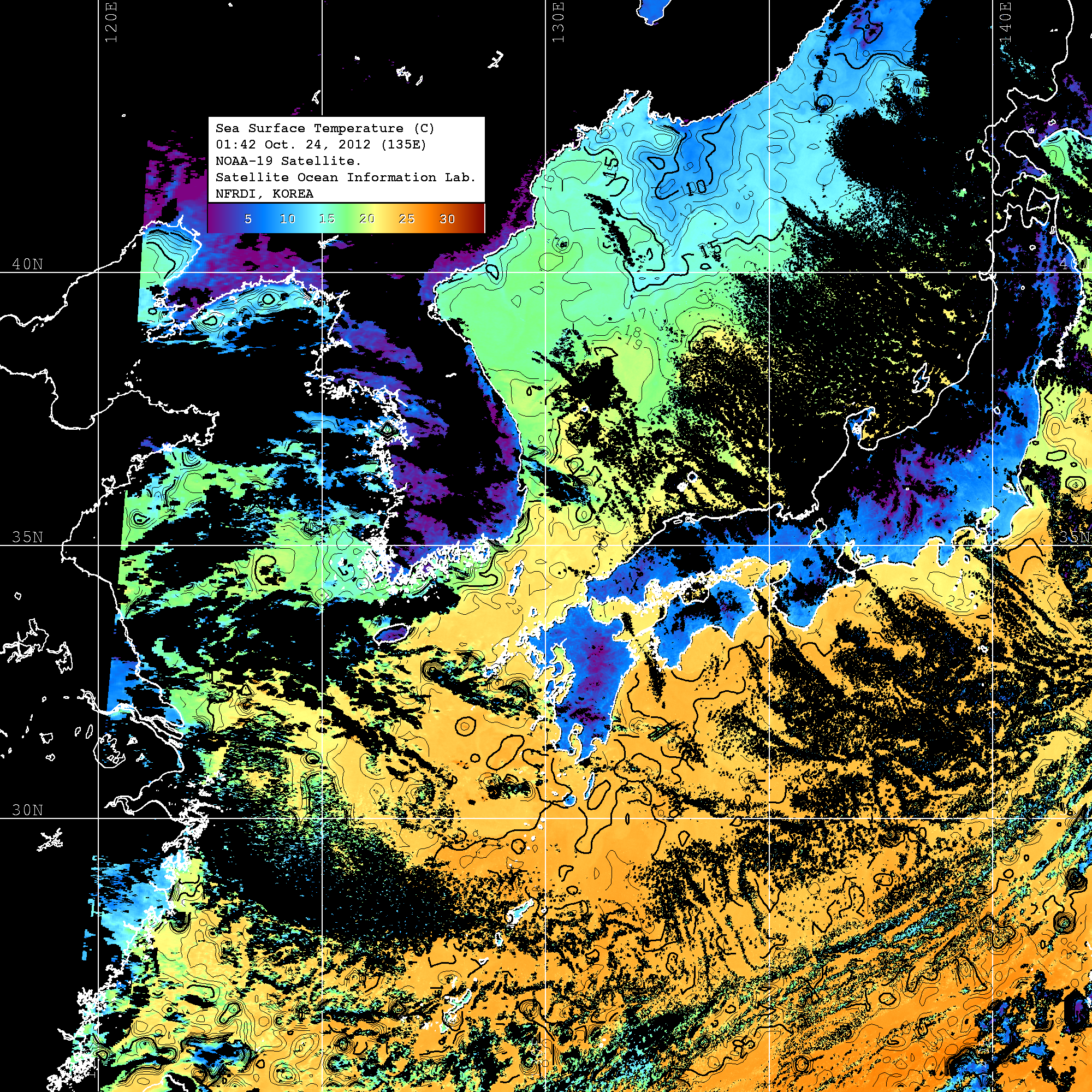 o 2012년 10월 24일 NOAA 위성영상입니다. o 영상 시간 및 수온분포는 범례를 참고하시기 바랍니다. o 검은색은 구름을 나타냅니다. o 그림을 클릭하시면 크게 보실 수 있습니다.