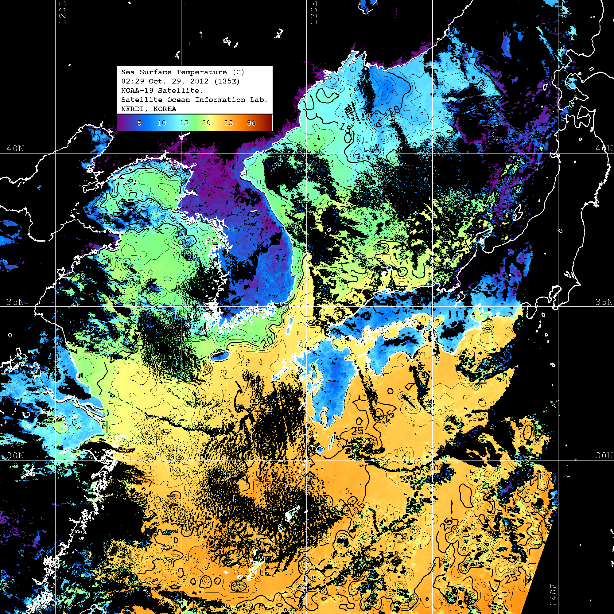 o 2012년 10월 29일 NOAA 위성영상입니다. o 영상 시간 및 수온분포는 범례를 참고하시기 바랍니다. o 검은색은 구름을 나타냅니다. o 그림을 클릭하시면 크게 보실 수 있습니다.