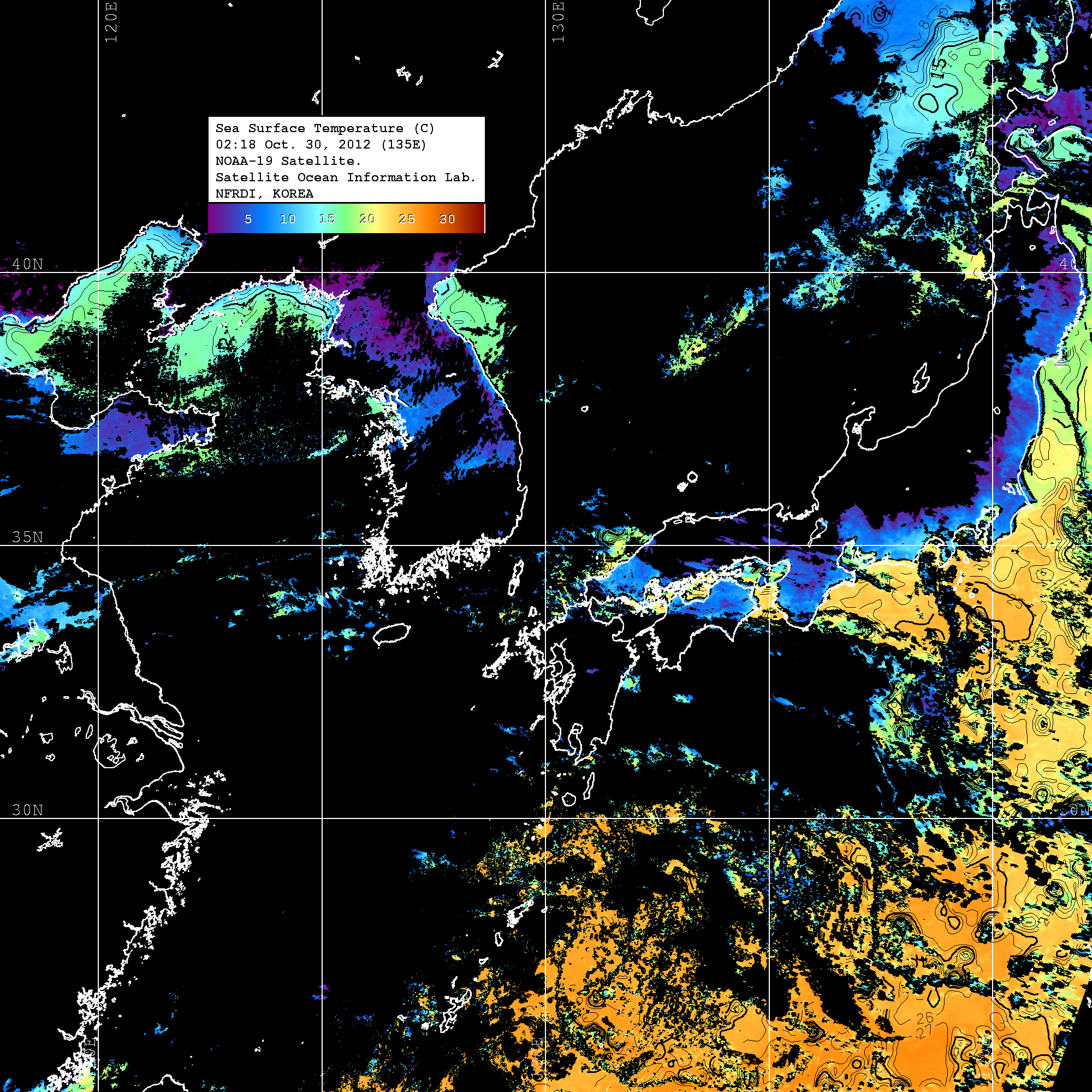 o 2012년 10월 30일 NOAA 위성영상입니다. o 영상 시간 및 수온분포는 범례를 참고하시기 바랍니다. o 검은색은 구름을 나타냅니다. o 그림을 클릭하시면 크게 보실 수 있습니다.