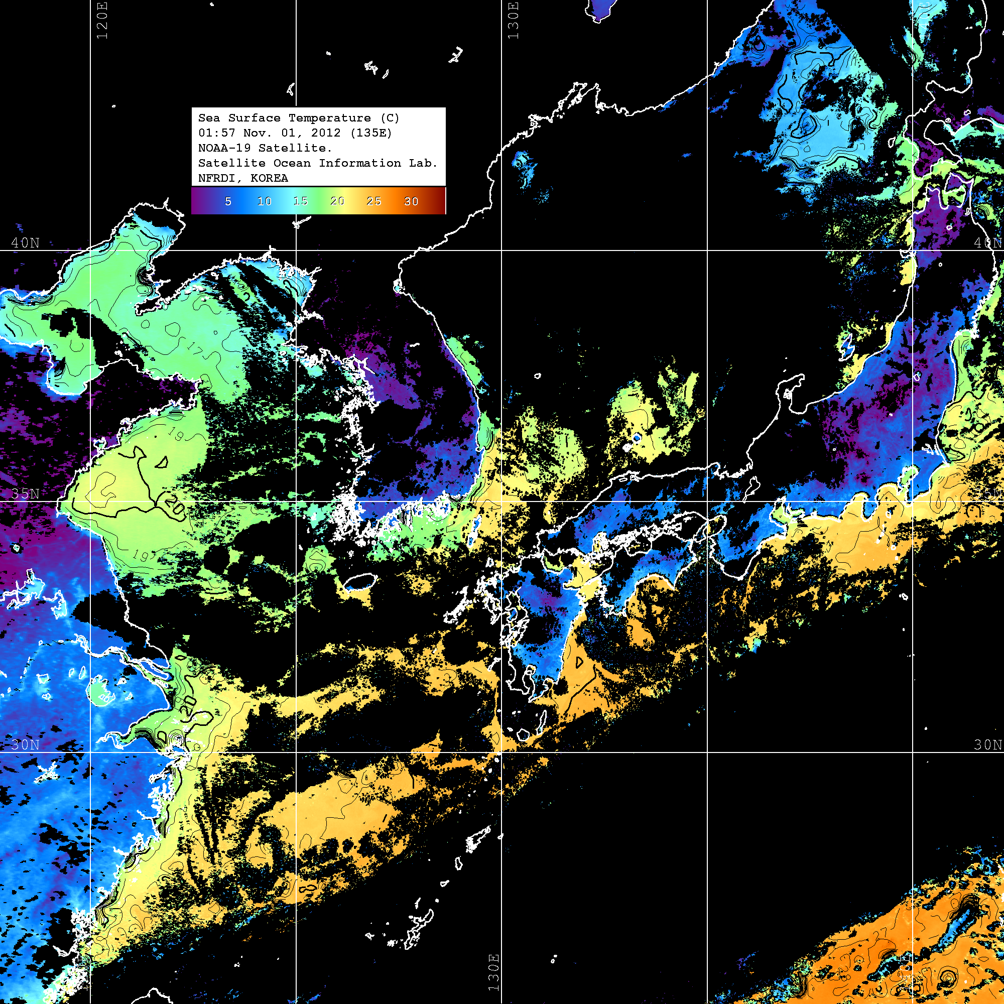 o 2012년 11월 01일 NOAA 위성영상입니다. o 영상 시간 및 수온분포는 범례를 참고하시기 바랍니다. o 검은색은 구름을 나타냅니다. o 그림을 클릭하시면 크게 보실 수 있습니다.