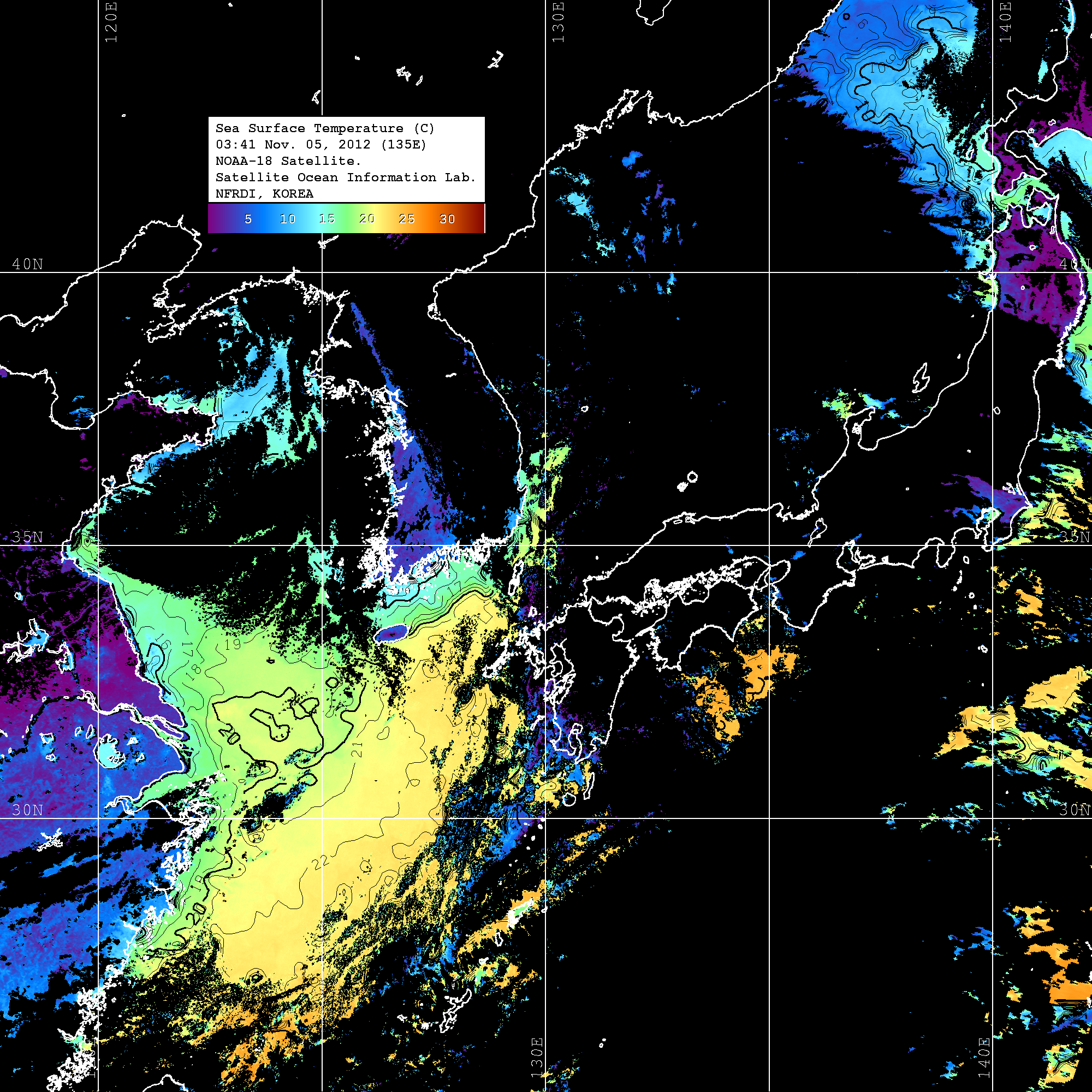 o 2012년 11월 05일 NOAA 위성영상입니다. o 영상 시간 및 수온분포는 범례를 참고하시기 바랍니다. o 검은색은 구름을 나타냅니다. o 그림을 클릭하시면 크게 보실 수 있습니다.