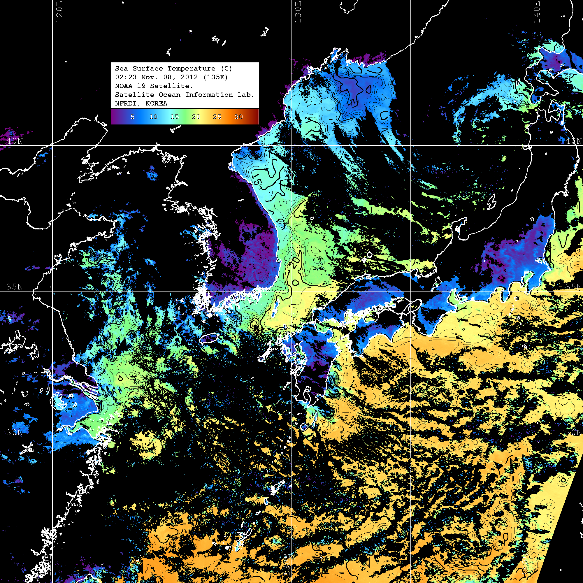 o 2012년 11월 07일 NOAA 위성영상입니다. o 영상 시간 및 수온분포는 범례를 참고하시기 바랍니다. o 검은색은 구름을 나타냅니다. o 그림을 클릭하시면 크게 보실 수 있습니다.