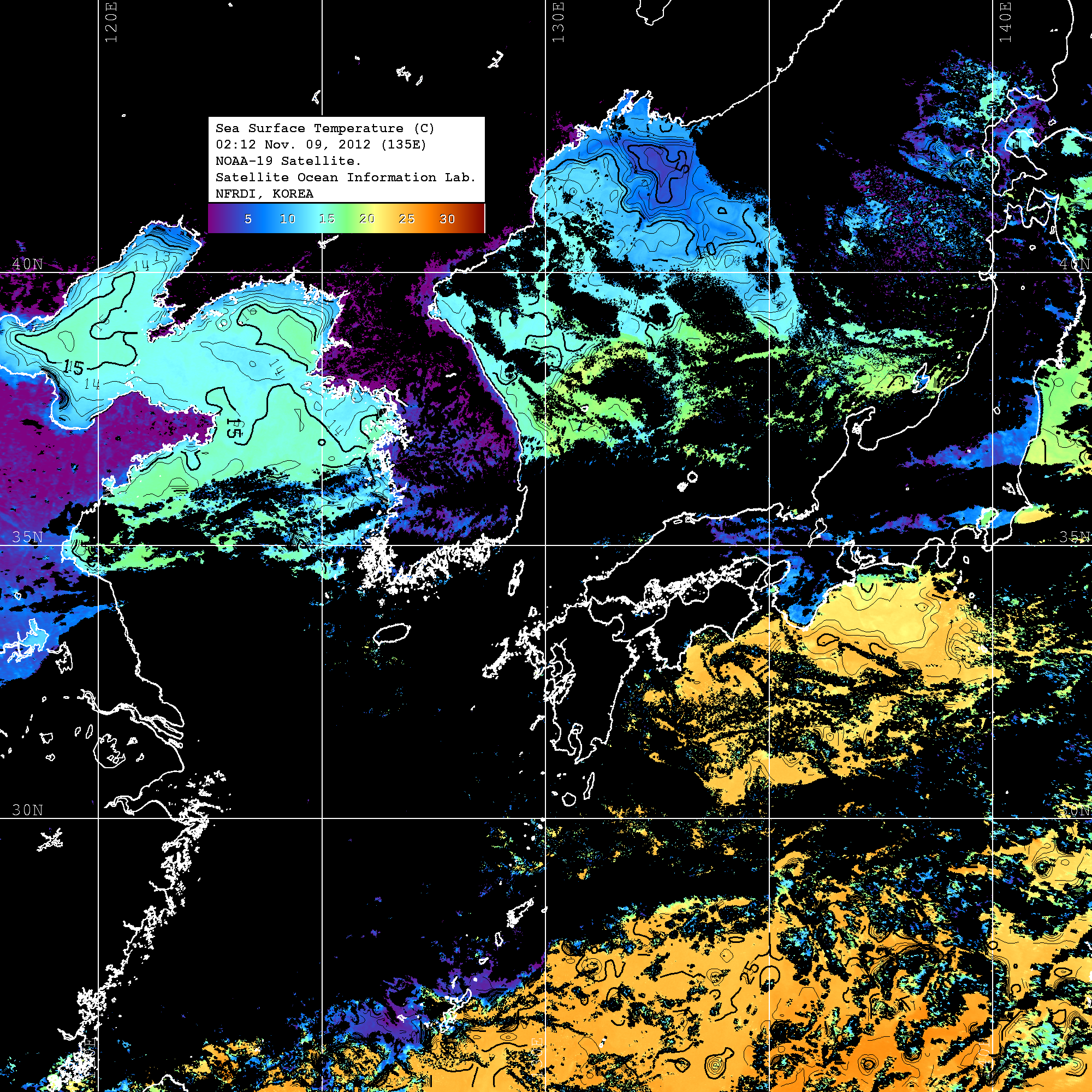 o 2012년 11월 09일 NOAA 위성영상입니다. o 영상 시간 및 수온분포는 범례를 참고하시기 바랍니다. o 검은색은 구름을 나타냅니다. o 그림을 클릭하시면 크게 보실 수 있습니다.