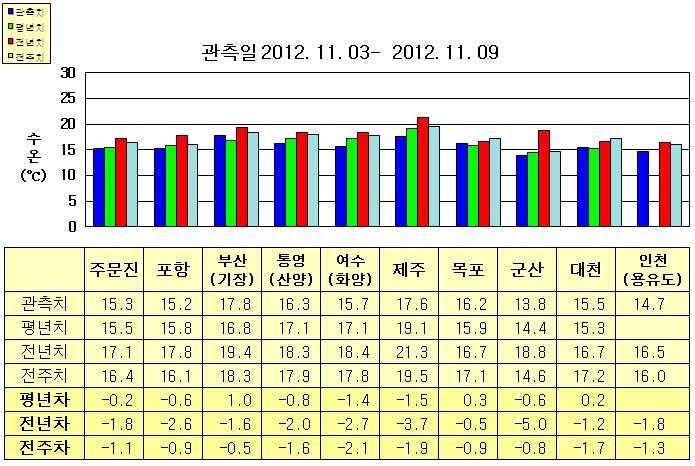 o 금주(2012.11.03~2012.11.09)의 한반도 연안 표면수온은 동해 연안역에서 섭씨 15~18도, 남해 연안역 15.5~18.0도, 서해 연안역에서 13.5~16.5도로 나타납니다. o 평년에 비해 부산(기장) 1도 높음을 제외한 동해 연안역은 0.5~1.0도 낮게, 남해 연안역은 0.5~1.5도 낮게, 군산 0.6도 낮음을 제외한 서해 연안역은 비슷하게 나타납니다. o 전년에 비해 동해 연안역은 1.5~3.0도 낮게, 남해 연안역은 2~4도 낮게, 서해 연안역은 0.5~5.0도 낮게 나타납니다.