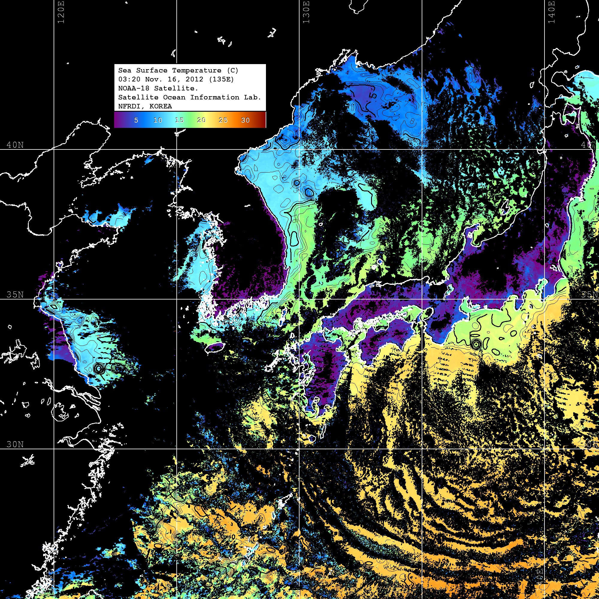 o 2012년 11월 16일 NOAA 위성영상입니다. o 영상 시간 및 수온분포는 범례를 참고하시기 바랍니다. o 검은색은 구름을 나타냅니다. o 그림을 클릭하시면 크게 보실 수 있습니다.