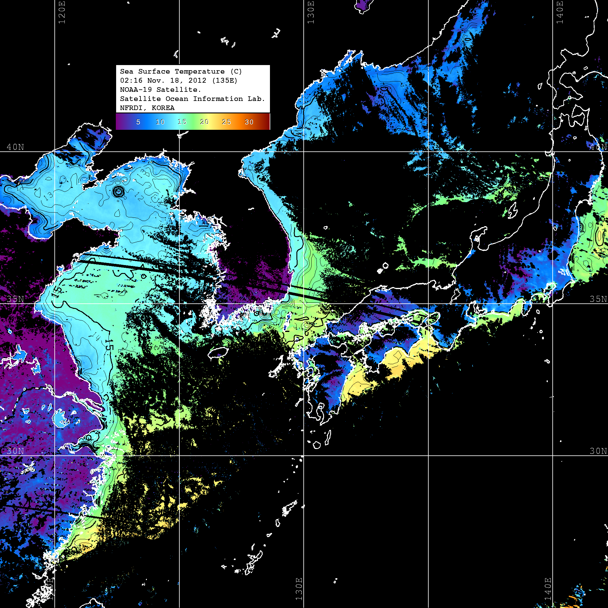 o 2012년 11월 18일 NOAA 위성영상입니다. o 영상 시간 및 수온분포는 범례를 참고하시기 바랍니다. o 검은색은 구름을 나타냅니다. o 그림을 클릭하시면 크게 보실 수 있습니다.