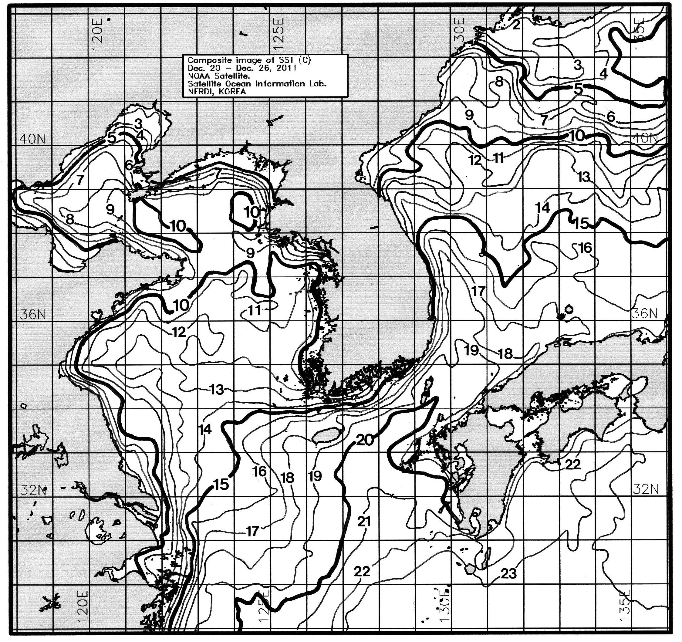 o 금주(2012.11.20~2012.11.26)의 한국근해 표면수온은 대화퇴 근해 11~12도, 울릉도-독도 근해 17~18도, 대마도 근해 19~20도, 제주도 근해 18~20도, 이어도 근해 18~19도, 가거초 근해 14~15도, 어청도 근해 13~14도, 백령도 근해 12~13도로 나타납니다. o「평년에 비해」대화퇴 근해 2.2도 낮게, 울릉도-독도 근해 0.7도 높게, 대마도 근해 비슷하게, 제주도 근해 0.7도 낮게, 이어도 근해 0.6도 낮게, 가거초 근해 0.7도 낮게, 어청도 근해는 비슷하게 나타납니다. o「전년에 비해」대화퇴 근해 3도 낮게, 울릉도-독도 근해 0.5도 낮게, 대마도 근해 1.5도 낮게, 제주도 근해 1.5도 낮게, 이어도 근해 0.5도 낮게, 가거초 근해 3도 낮게, 어청도 근해는 비슷하게, 백령도 근해 0.5도 높게 나타납니다. o 수온 전선대는 우리나라 제주해협에서 대한해협까지 17도를 중심으로 형성됩니다.