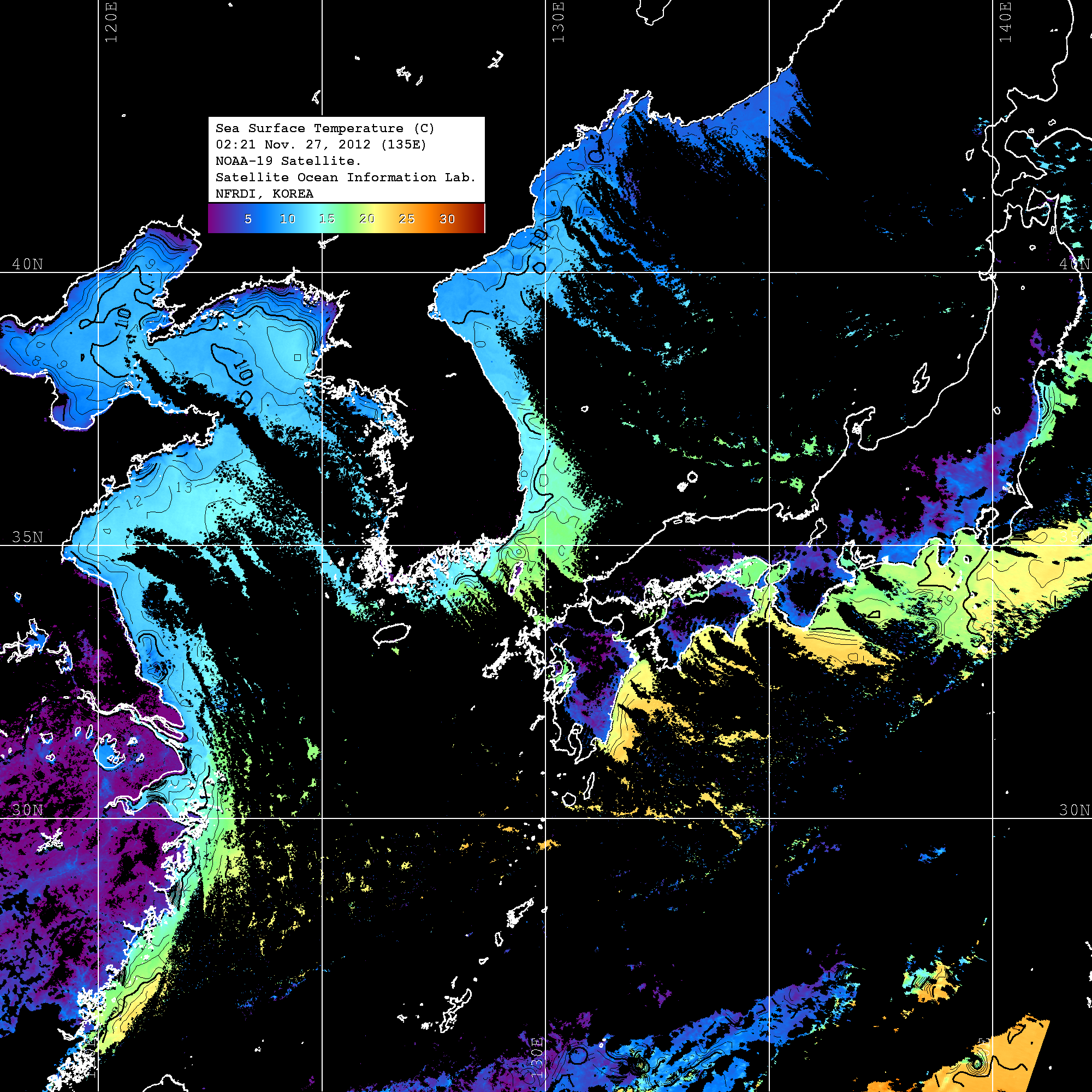 o 2012년 11월 27일 NOAA 위성영상입니다. o 영상 시간 및 수온분포는 범례를 참고하시기 바랍니다. o 검은색은 구름을 나타냅니다. o 그림을 클릭하시면 크게 보실 수 있습니다.