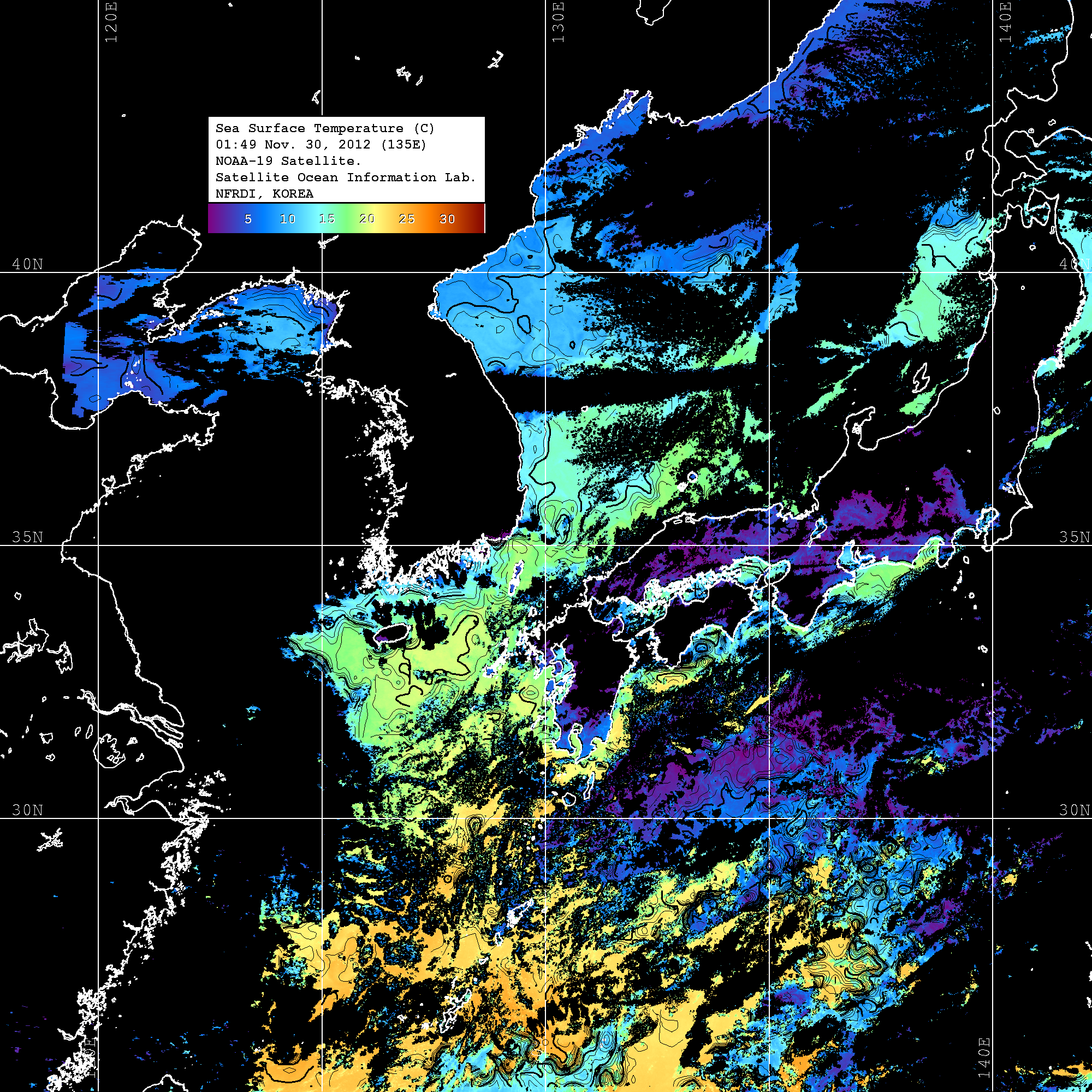 o 2012년 11월 30일 NOAA 위성영상입니다. o 영상 시간 및 수온분포는 범례를 참고하시기 바랍니다. o 검은색은 구름을 나타냅니다. o 그림을 클릭하시면 크게 보실 수 있습니다.