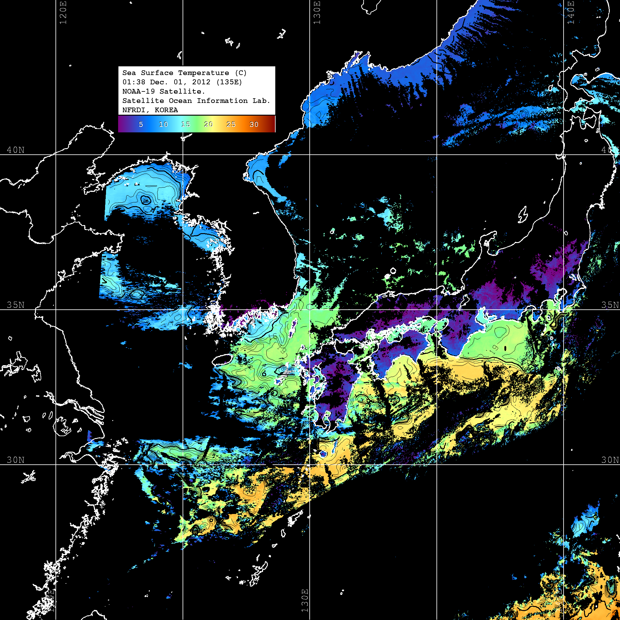 o 2012년 12월 01일 NOAA 위성영상입니다. o 영상 시간 및 수온분포는 범례를 참고하시기 바랍니다. o 검은색은 구름을 나타냅니다. o 그림을 클릭하시면 크게 보실 수 있습니다.