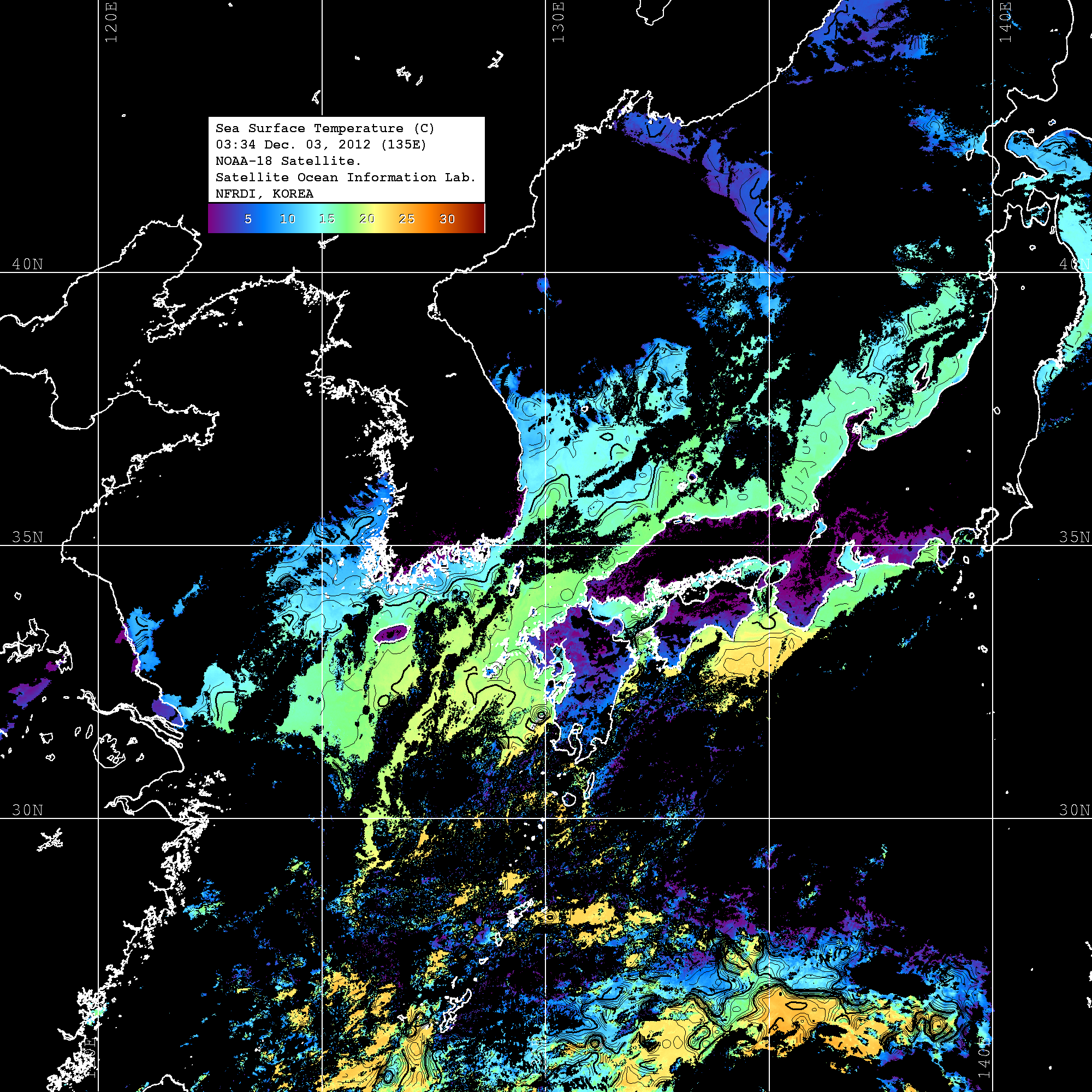 o 2012년 12월 03일 NOAA 위성영상입니다. o 영상 시간 및 수온분포는 범례를 참고하시기 바랍니다. o 검은색은 구름을 나타냅니다. o 그림을 클릭하시면 크게 보실 수 있습니다.