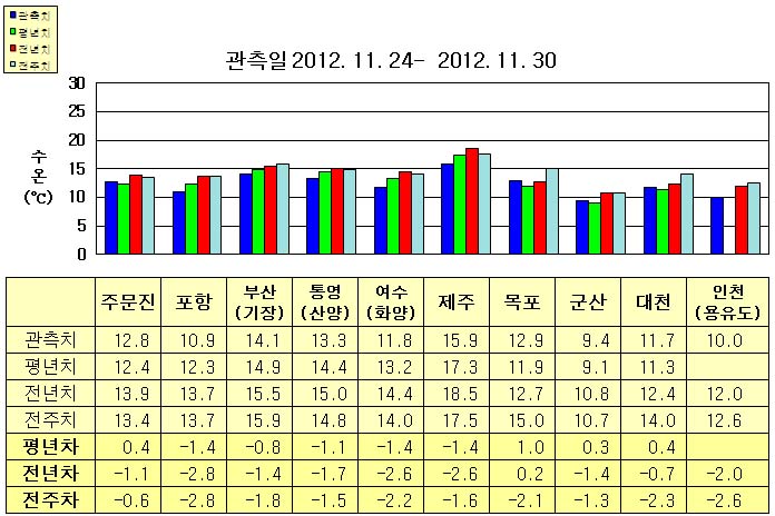 o 금주(2012.11.24~2012.11.30)의 한반도 연안 표면수온은 동해 연안역에서 섭씨 10.5~14.5도, 남해 연안역 11.5~16.0도, 서해 연안역에서 9~13도로 나타납니다. o 평년에 비해 주문진 0.4도 높음을 제외한 동해 연안역은 0.5∼1.5도 낮게, 남해 연안역은 1.0∼1.5도 낮게, 목포 1도 높음을 제외한 서해 연안역은 비슷하게 나타납니다. o 전년에 비해 동해 연안역은 1~3도 낮게, 남해 연안역은 1.5~3.0도 낮게, 목포 비슷함을 제외한 서해 연안역은 0.5~2.0도 낮게 나타납니다.