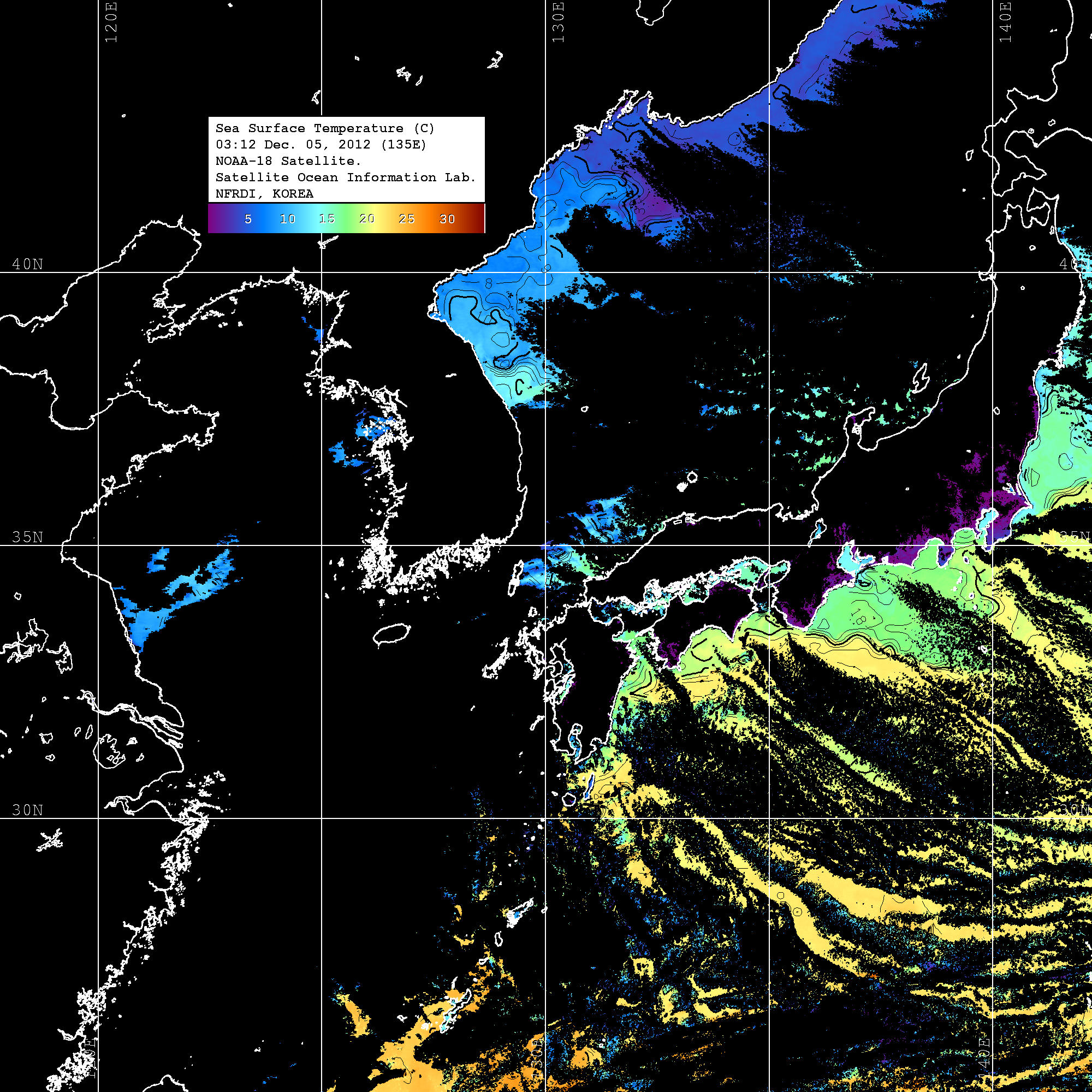 o 2012년 12월 05일 NOAA 위성영상입니다. o 영상 시간 및 수온분포는 범례를 참고하시기 바랍니다. o 검은색은 구름을 나타냅니다. o 그림을 클릭하시면 크게 보실 수 있습니다.