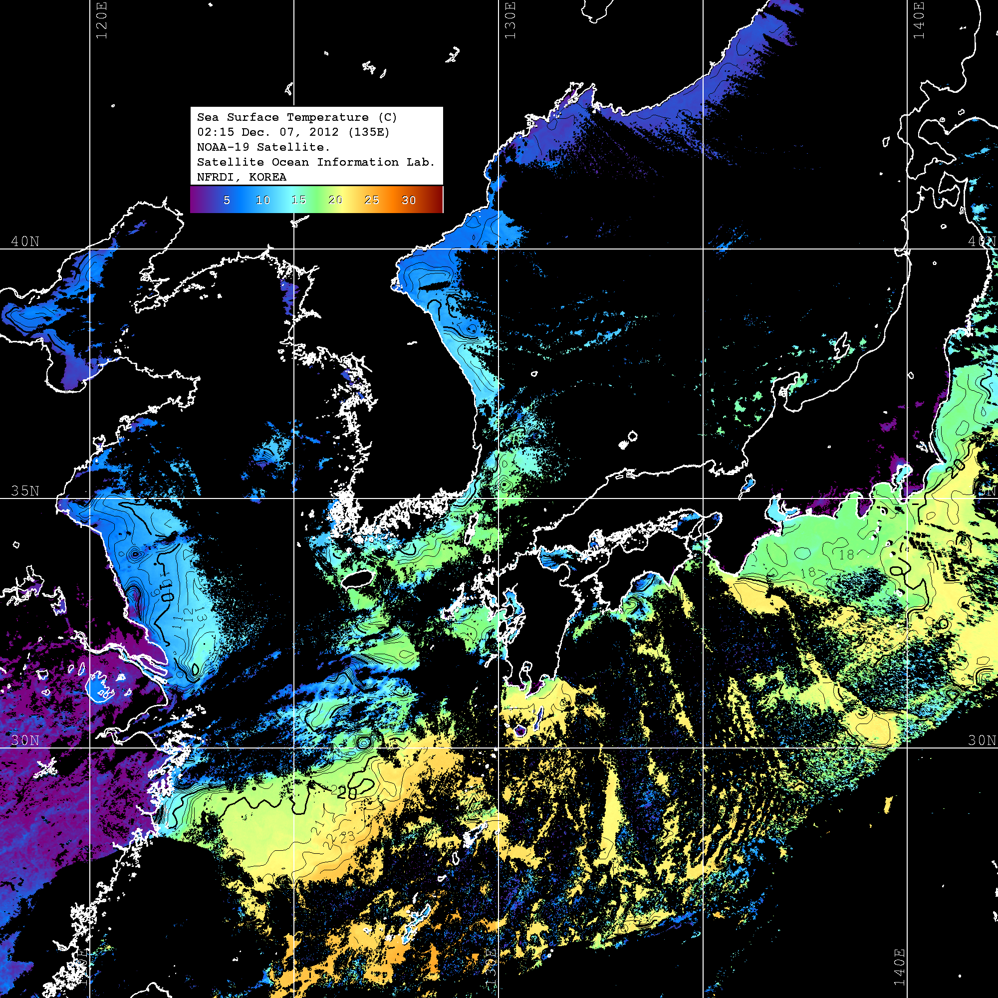o 2012년 12월 07일 NOAA 위성영상입니다. o 영상 시간 및 수온분포는 범례를 참고하시기 바랍니다. o 검은색은 구름을 나타냅니다. o 그림을 클릭하시면 크게 보실 수 있습니다.