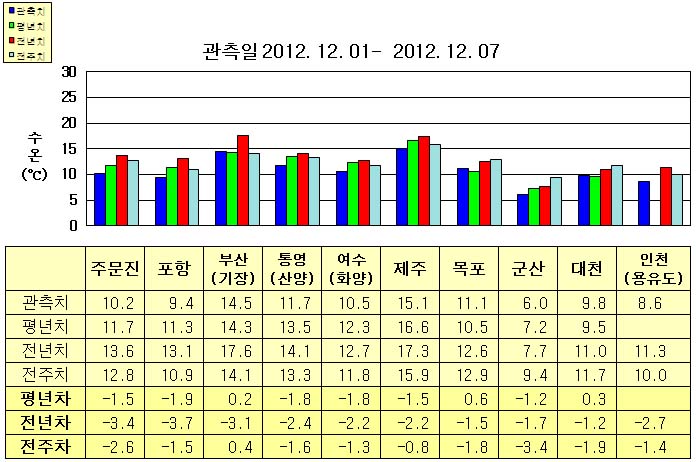 o 금주(2012.12.01~2012.12.07)의 한반도 연안 표면수온은 동해 연안역에서 섭씨 9.0~14.5도, 남해 연안역 10.5~15.5도, 서해 연안역에서 6.0~11.5도로 나타납니다. o 평년에 비해 부산(기장) 비슷함을 제외한 동해 연안역은 1.5∼2.0도 낮게, 남해 연안역은 1.5∼2.0도 낮게, 서해 연안역은 목포 0.6도 높게, 군산 1.2도 낮게, 대천 비슷하게 나타납니다. o 전년에 비해 동해 연안역은 3~4도 낮게, 남해 연안역은 2.0~2.5도 낮게, 서해 연안역은 1~3도 낮게 나타납니다.