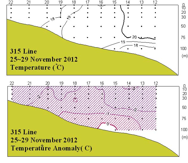 ㅇ 2012년 11월 25~29일 국립수산과학원 남서해수산연구소에서 조사한 동중국해 북부해역(315선)의 수온 수직분포도와 평년편차도입니다. ㅇ 수심 약 75m까지는 연직적으로 잘 혼합된 양상을 보였습니다. ㅇ 평년에 비하여 대부분의 해역에서 1~3℃의 범위의 저온현상을 나타내었습니다.