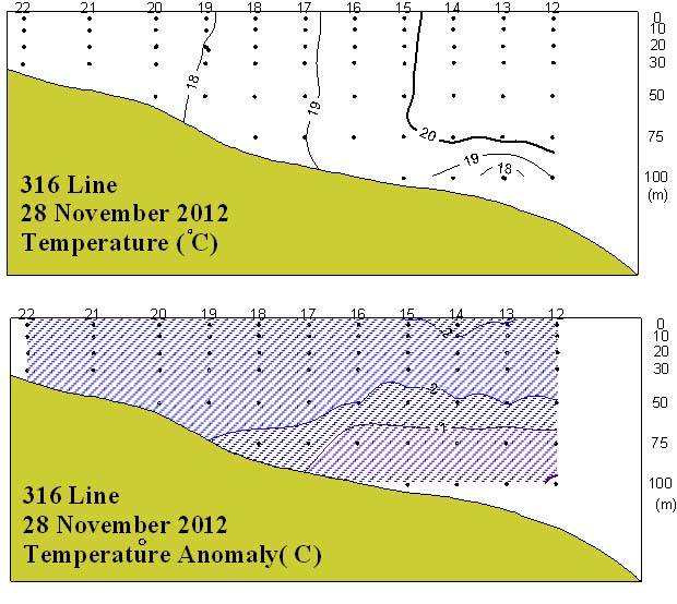 ㅇ 2012년 11월 28일 국립수산과학원 남서해수산연구소에서 조사한 동중국해 북부해역(316선)의 수온 수직분포도와 평년편차도입니다. ㅇ 수심 약 75m까지는 연직적으로 잘 혼합된 양상을 보였습니다. ㅇ 평년에 비하여 대부분의 해역에서 1~2℃ 범위의 저온현상을 나타났습니다.