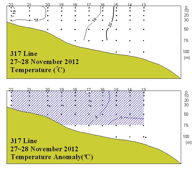 ㅇ 2012년 11월 27~28일 국립수산과학원 남서해수산연구소에서 조사한 동중국해 북부해역(317선)의 수온 수직분포도와 평년편차도입니다. ㅇ 관측해역 내에서 동부해역이 서부해역보다 수온이 다소 높게 나타났습니다. ㅇ 평년에 비하여 대부분의 해역에서 1~2℃ 범위의 저온현상을 나타났습니다.