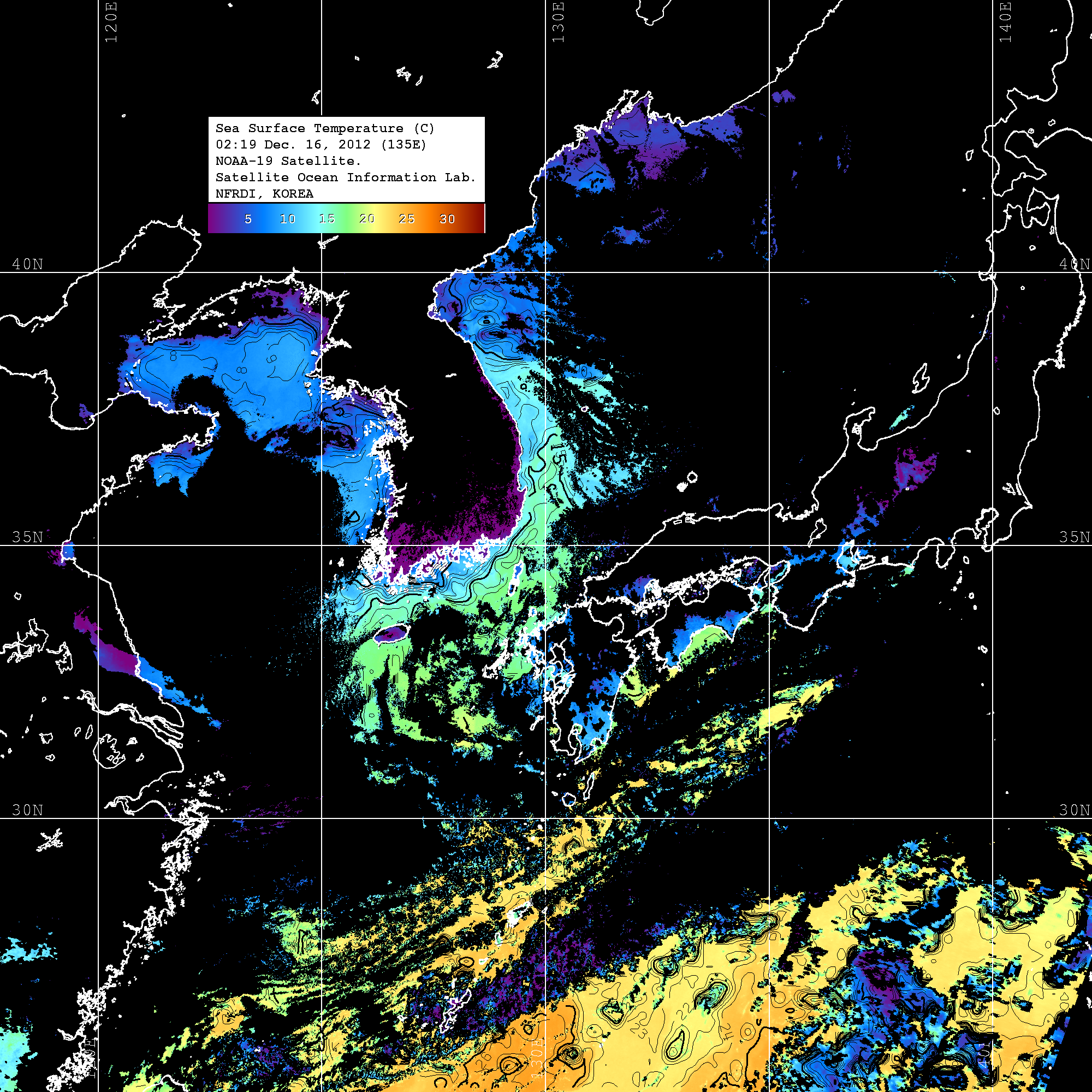 o 2012년 12월 16일 NOAA 위성영상입니다. o 영상 시간 및 수온분포는 범례를 참고하시기 바랍니다. o 검은색은 구름을 나타냅니다. o 그림을 클릭하시면 크게 보실 수 있습니다.