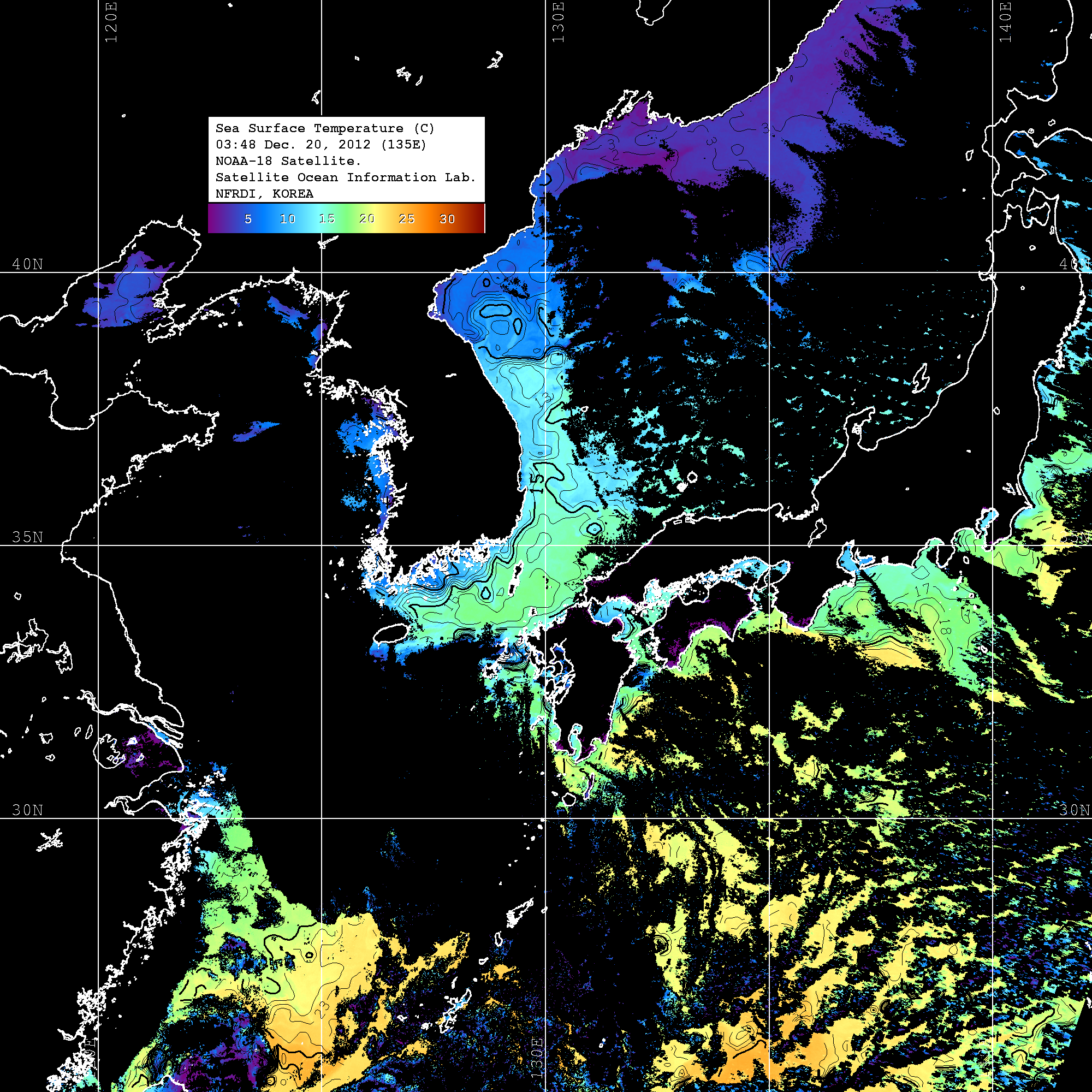 o 2012년 12월 20일 NOAA 위성영상입니다. o 영상 시간 및 수온분포는 범례를 참고하시기 바랍니다. o 검은색은 구름을 나타냅니다. o 그림을 클릭하시면 크게 보실 수 있습니다.