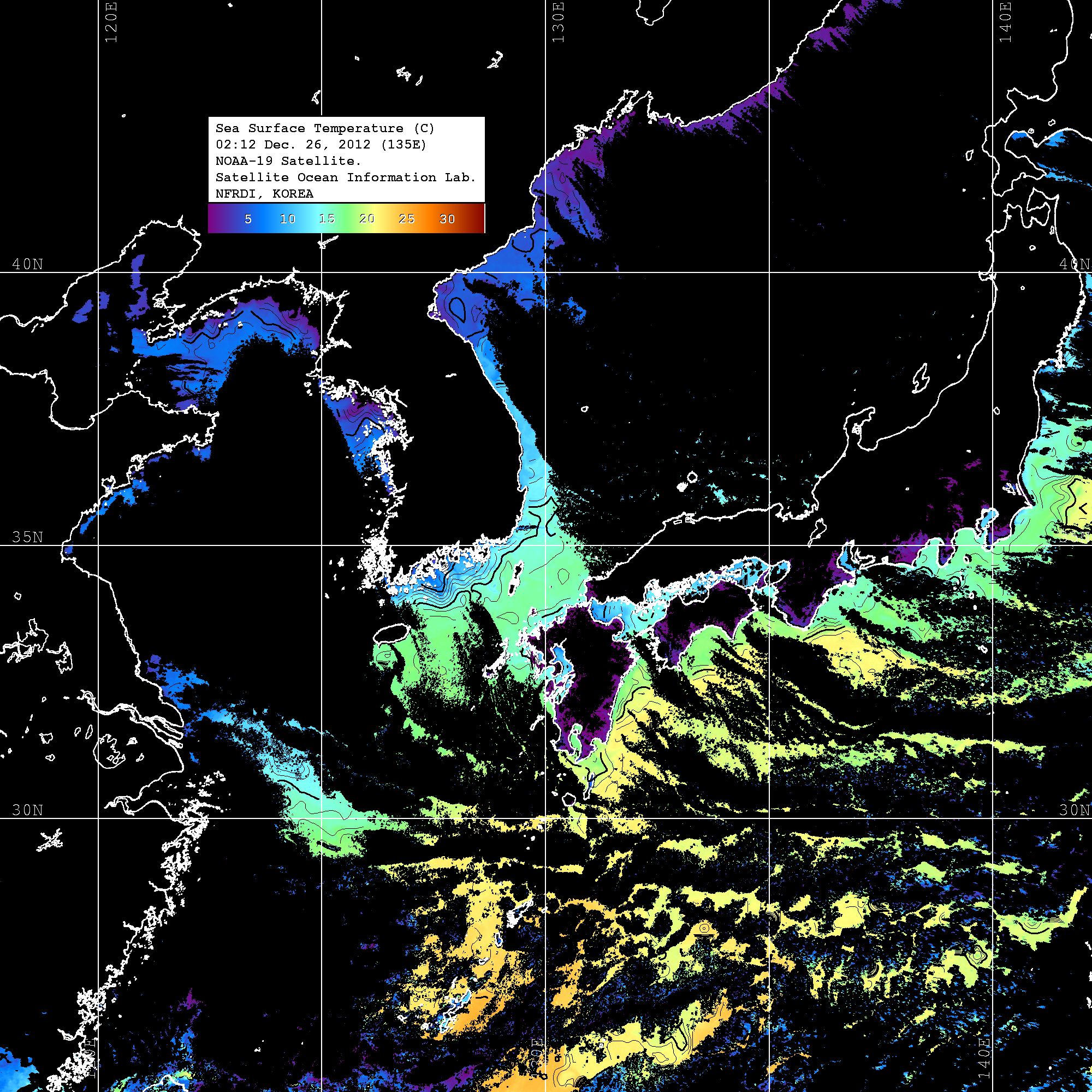 o 2012년 12월 26일 NOAA 위성영상입니다. o 영상 시간 및 수온분포는 범례를 참고하시기 바랍니다. o 검은색은 구름을 나타냅니다. o 그림을 클릭하시면 크게 보실 수 있습니다.