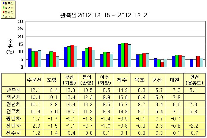 o 금주(2012.12.15~2012.12.21)의 한반도 연안 표면수온은 동해 연안역에서 섭씨 8.0~13.5도, 남해 연안역 8.5~15.0도, 서해 연안역에서 5.0~8.5도로 나타납니다. o 평년에 비해 동해 연안역은 주문진 1.7도 높게, 포항 1.7도 낮게, 부산(기장) 비슷하게, 남해 연안역은 0.5∼2.0도 낮게, 서해 연안역은 목포 비슷하게, 군산 0.7도 높게, 대천 0.7도 낮게 나타납니다. o 전년에 비해 주문진 2도 높음을 제외한 동해 연안역은 1.0~1.5도 낮게, 남해 연안역은 0.5~3.0도 낮게, 군산 2.3도 높음을 제외한 서해 연안역은 0.5~2.5도 낮게 나타납니다.