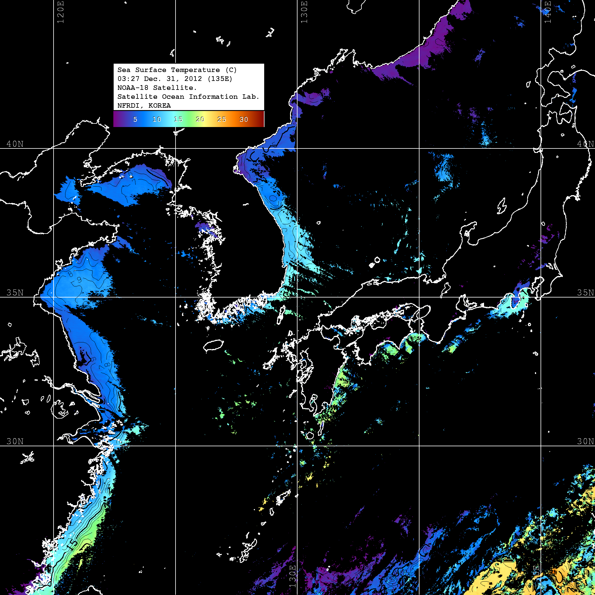 o 2012년 12월 31일 NOAA 위성영상입니다. o 영상 시간 및 수온분포는 범례를 참고하시기 바랍니다. o 검은색은 구름을 나타냅니다. o 그림을 클릭하시면 크게 보실 수 있습니다.