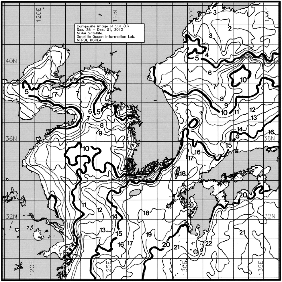 o 금주(2012.12.25~2012.12.31)의 한국근해 표면수온은 대화퇴 근해 8~9도, 울릉도-독도 근해 12~13도, 대마도 근해 17~18도, 제주도 근해 16~18도, 이어도 근해 12~13도, 가거초 근해 12~13도, 어청도 근해 8~9도, 백령도 근해 4∼5도로 나타납니다. o「평년에 비해」대화퇴 근해 2.4도 낮게, 울릉도-독도 근해 1.3도 낮게, 대마도 근해 비슷하게, 제주도 근해 비슷하게, 이어도 근해 1.8도 낮게, 가거초 근해 0.4도 낮게, 어청도 근해는 0.9도 낮게 나타납니다. o「전년에 비해」대화퇴 근해 0.9도 낮게, 울릉도-독도 근해 2도 낮게, 대마도 근해 1.5도 낮게, 제주도 근해 1도 낮게, 이어도 근해 3도 낮게, 가거초 근해 2도 낮게, 어청도 근해는 3도 낮게, 백령도 근해 5도 낮게 나타납니다. o 수온 전선대는 우리나라 제주해협에서 대한해협까지 16도를 중심으로 형성됩니다. (http://www.nfrdi.re.kr/bbs?id=newfish) 에서도 이용하실 수 있습니다.