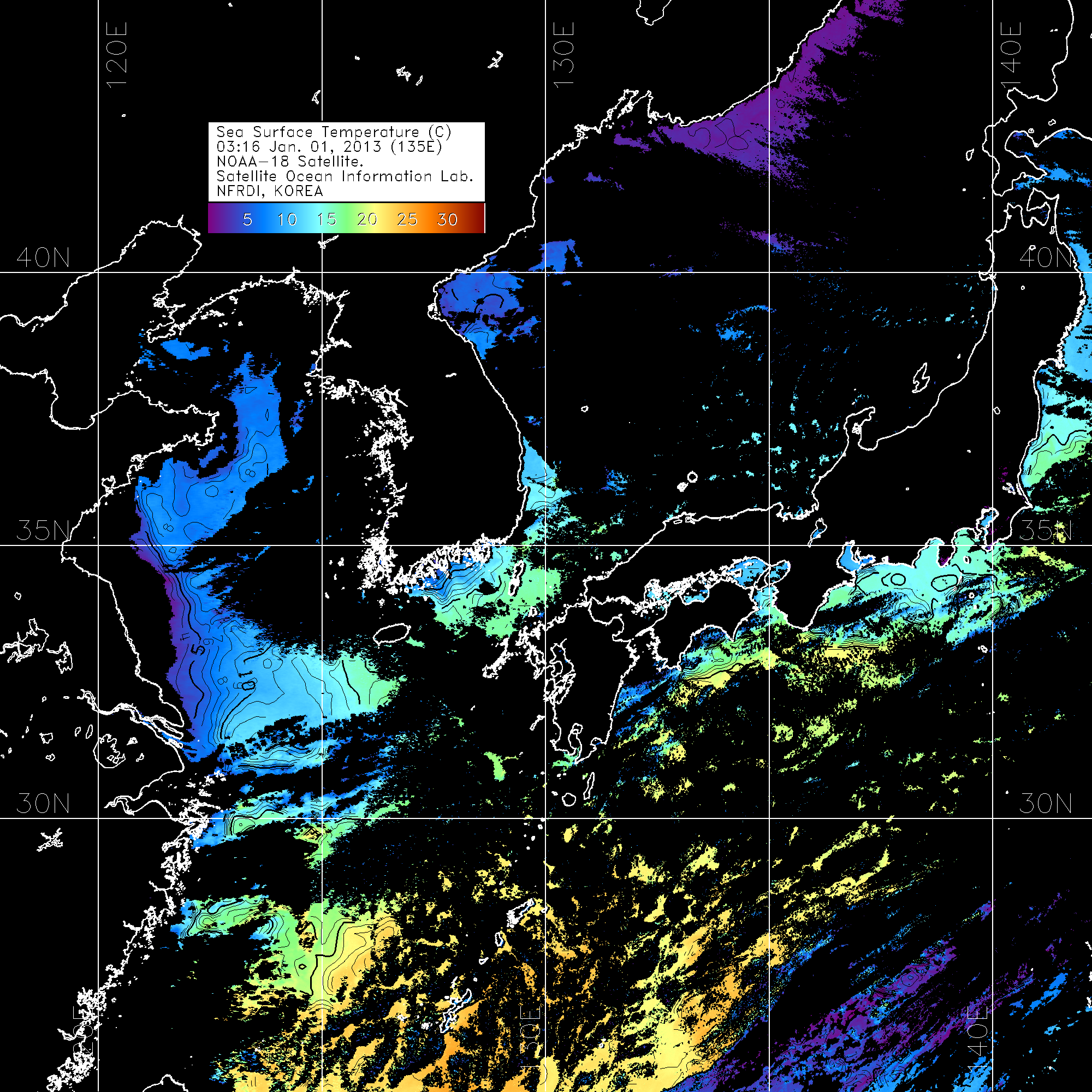 o 2013년 01월 01일 NOAA 위성영상입니다. o 영상 시간 및 수온분포는 범례를 참고하시기 바랍니다. o 검은색은 구름을 나타냅니다. o 그림을 클릭하시면 크게 보실 수 있습니다.