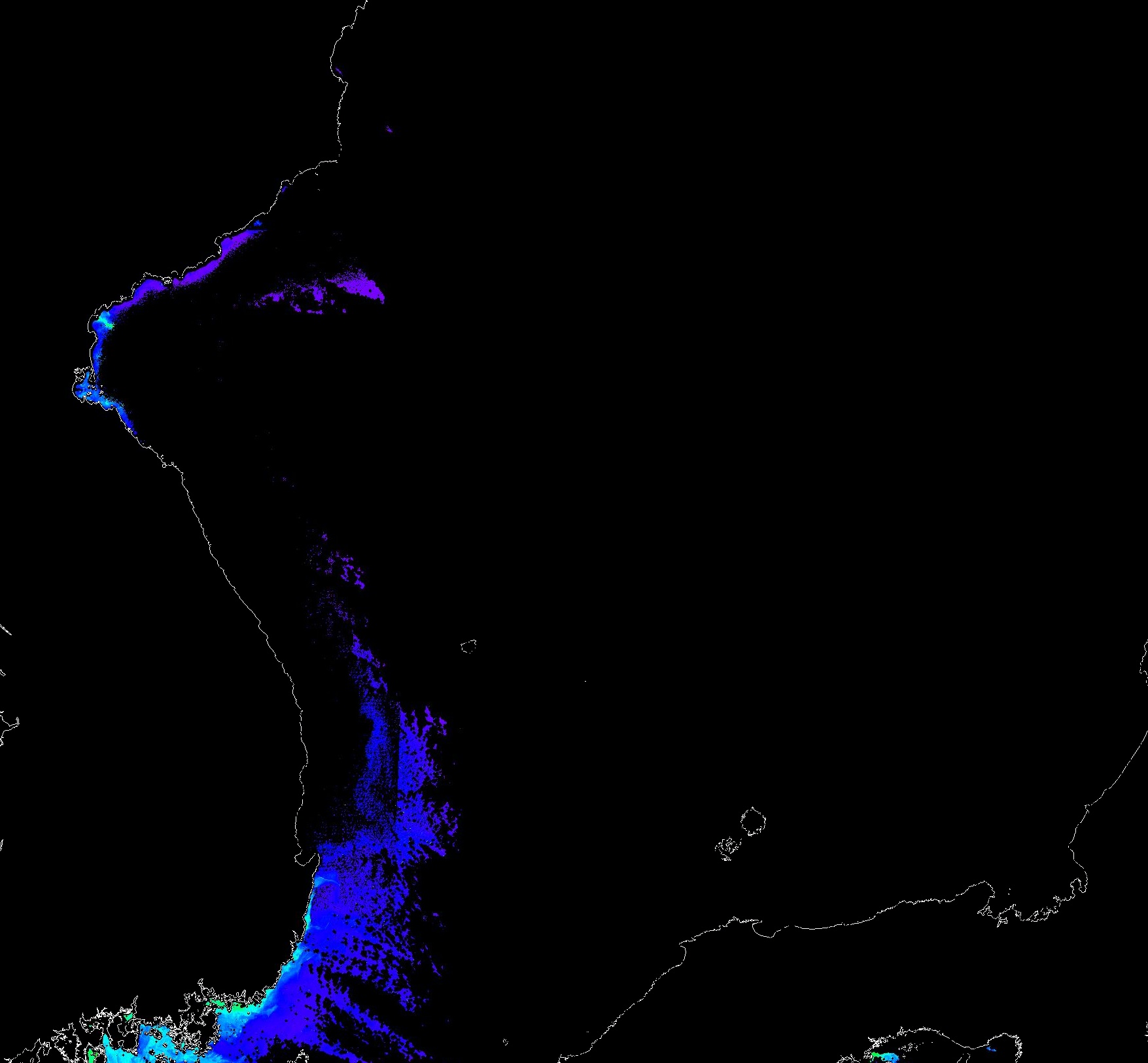 o 2012년 12월 31일 천리안 GOCI 위성영상입니다. [ GOCI : Geostationary Ocean Color Imager ] o 농도분포는 하단 범례를 참고하시기 바랍니다. o 검은색은 구름을 나타냅니다. o 그림을 클릭하시면 크게 보실 수 있습니다. o 천리안 GOCI 클로로필 a 동해지역. o 천리안 GOCI 클로로필 a 서해지역. o 천리안 GOCI 클로로필 a 남해지역. 천리안 GOCI 클로로필 a 둥중국해지역. o 천리안 GOCI 클로로필 a 대화퇴지역. ![]() 천리안 GOCI 영상은 한국해양과학기술원 해양위성센터에서 수신하였습니다. |