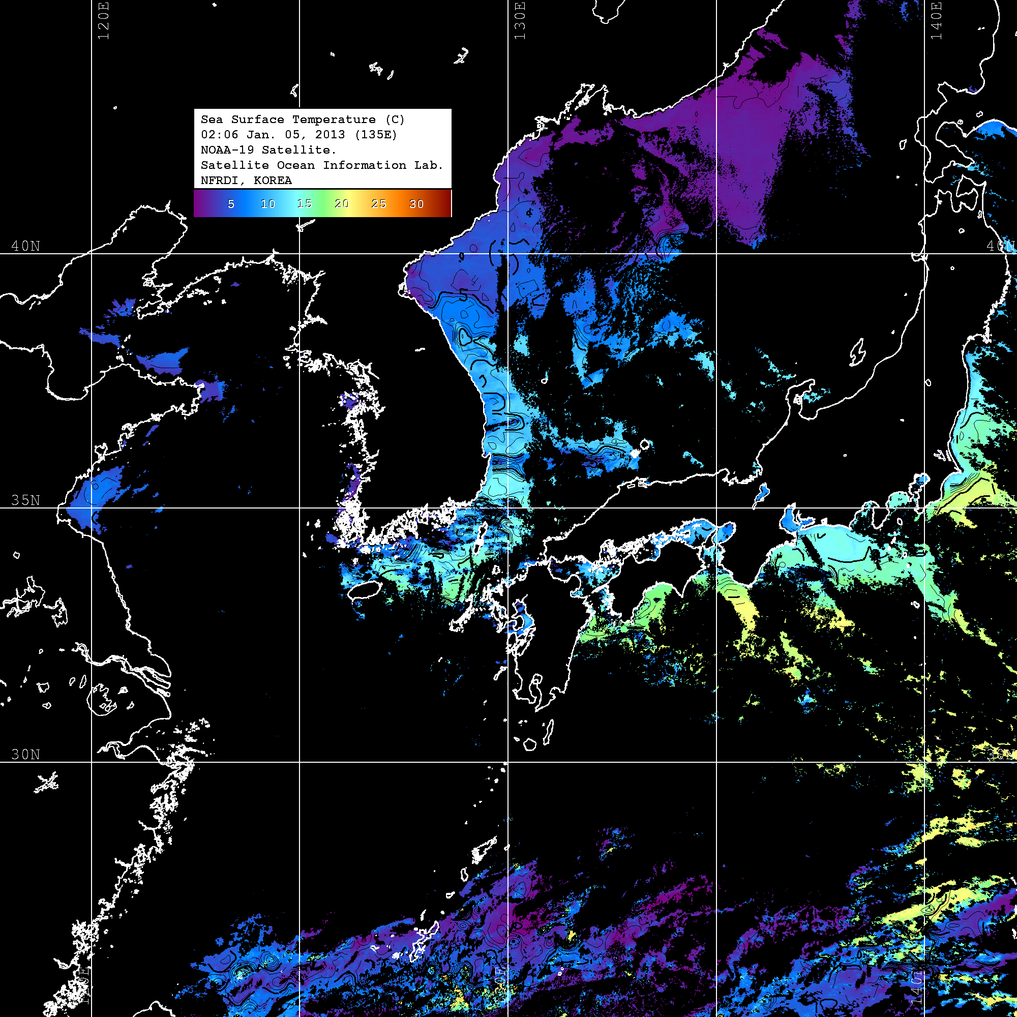 o 2013년 01월 05일 NOAA 위성영상입니다. o 영상 시간 및 수온분포는 범례를 참고하시기 바랍니다. o 검은색은 구름을 나타냅니다. o 그림을 클릭하시면 크게 보실 수 있습니다.