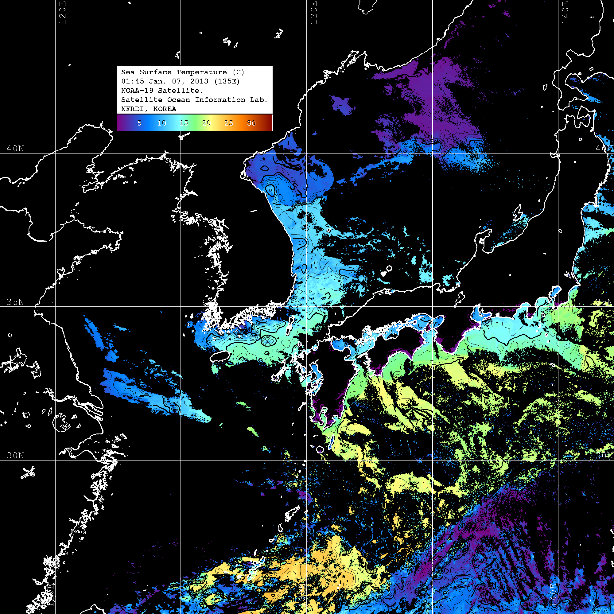 o 2013년 01월 07일 NOAA 위성영상입니다. o 영상 시간 및 수온분포는 범례를 참고하시기 바랍니다. o 검은색은 구름을 나타냅니다. o 그림을 클릭하시면 크게 보실 수 있습니다.