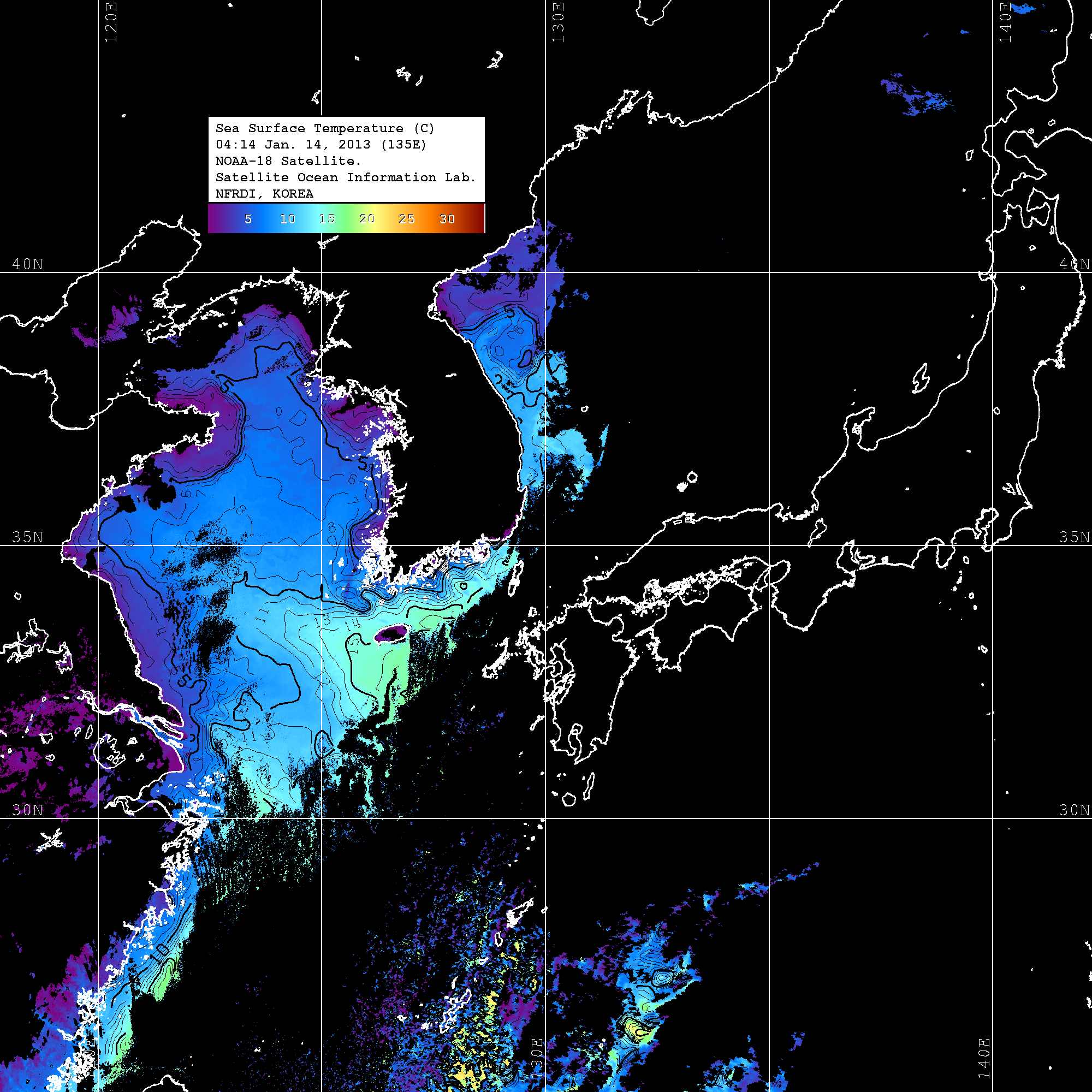 o 2013년 01월 14일 NOAA 위성영상입니다. o 영상 시간 및 수온분포는 범례를 참고하시기 바랍니다. o 검은색은 구름을 나타냅니다. o 그림을 클릭하시면 크게 보실 수 있습니다.