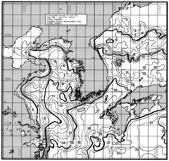 o 금주(2013.01.08~2013.01.14)의 한국근해 표면수온은 대화퇴 근해 6~8도, 울릉도-독도 근해 10~12도, 대마도 근해 16~17도, 제주도 근해 16~17도, 이어도 근해 11~12도, 가거초 근해 10~11도, 어청도 근해 8~9도, 백령도 근해 5∼6도로 나타납니다. o「평년에 비해」대화퇴 근해 2.5도 낮게, 울릉도-독도 근해 1.6도 낮게, 대마도 근해 비슷하게, 제주도 근해 비슷하게, 이어도 근해 1.4도 낮게, 가거초 근해 0.5도 낮게, 어청도 근해는 0.8도 높게 나타납니다. o「전년에 비해」대화퇴 근해 2.5도 낮게, 울릉도-독도 근해 2도 낮게, 대마도 근해 1도 낮게, 제주도 근해 0.5도 낮게, 이어도 근해 1.5도 낮게, 가거초 근해 0.5도 낮게, 어청도 근해는 비슷하게, 백령도 근해 비슷하게 나타납니다. o 수온 전선대는 우리나라 제주해협에서 대한해협까지 15도를 중심으로 형성됩니다.