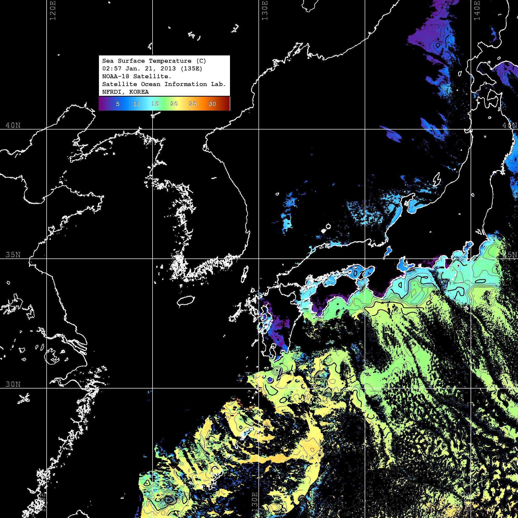 o 2013년 01월 21일 NOAA 위성영상입니다. o 영상 시간 및 수온분포는 범례를 참고하시기 바랍니다. o 검은색은 구름을 나타냅니다. o 그림을 클릭하시면 크게 보실 수 있습니다.