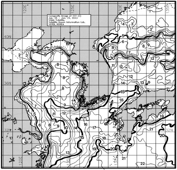o 금주(2013.01.15~2013.01.21)의 한국근해 표면수온은 대화퇴 근해 6~7도, 울릉도-독도 근해 11~12도, 대마도 근해 15~16도, 제주도 근해 15~16도, 이어도 근해 10~11도, 가거초 근해 10~11도, 어청도 근해 7~8도, 백령도 근해 6∼7도로 나타납니다. o「평년에 비해」대화퇴 근해 2.7도 낮게, 울릉도-독도 근해 비슷하게, 대마도 근해 0.4도 낮게, 제주도 근해 1도 낮게, 이어도 근해 1.9도 낮게, 가거초 근해 1도 낮게, 어청도 근해는 비슷하게 나타납니다. o「전년에 비해」대화퇴 근해 6도 낮게, 울릉도-독도 근해 비슷하게, 대마도 근해 0.5도 낮게, 제주도 근해 0.5도 낮게, 이어도 근해 2도 낮게, 가거초 근해 1도 낮게, 어청도 근해는 1도 낮게, 백령도 근해 1도 높게 나타납니다. o 수온 전선대는 우리나라 제주해협에서 대한해협까지 14도를 중심으로 형성됩니다. (http://www.nfrdi.re.kr/bbs?id=newfish) 에서도 이용하실 수 있습니다.