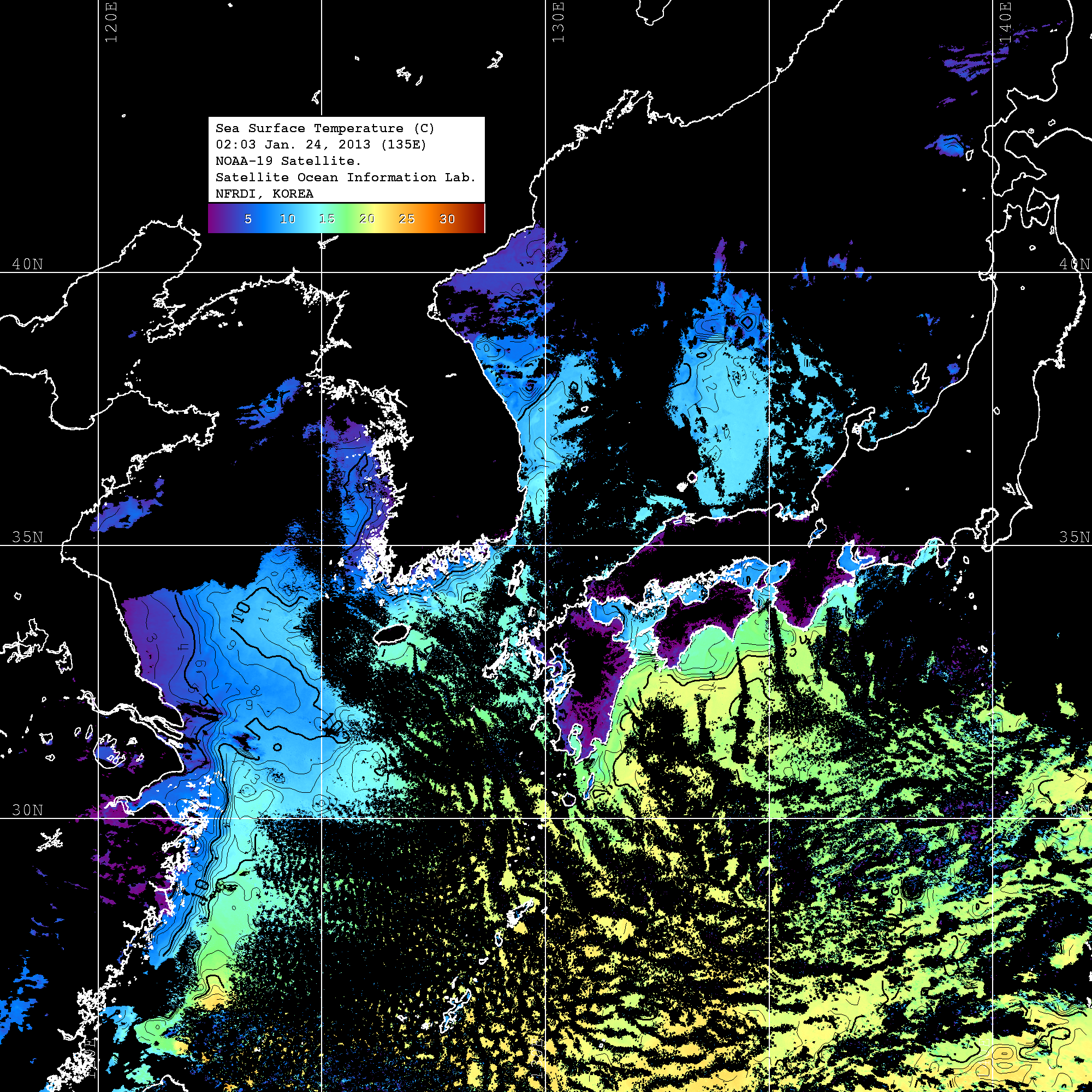 o 2013년 01월 24일 NOAA 위성영상입니다. o 영상 시간 및 수온분포는 범례를 참고하시기 바랍니다. o 검은색은 구름을 나타냅니다. o 그림을 클릭하시면 크게 보실 수 있습니다.