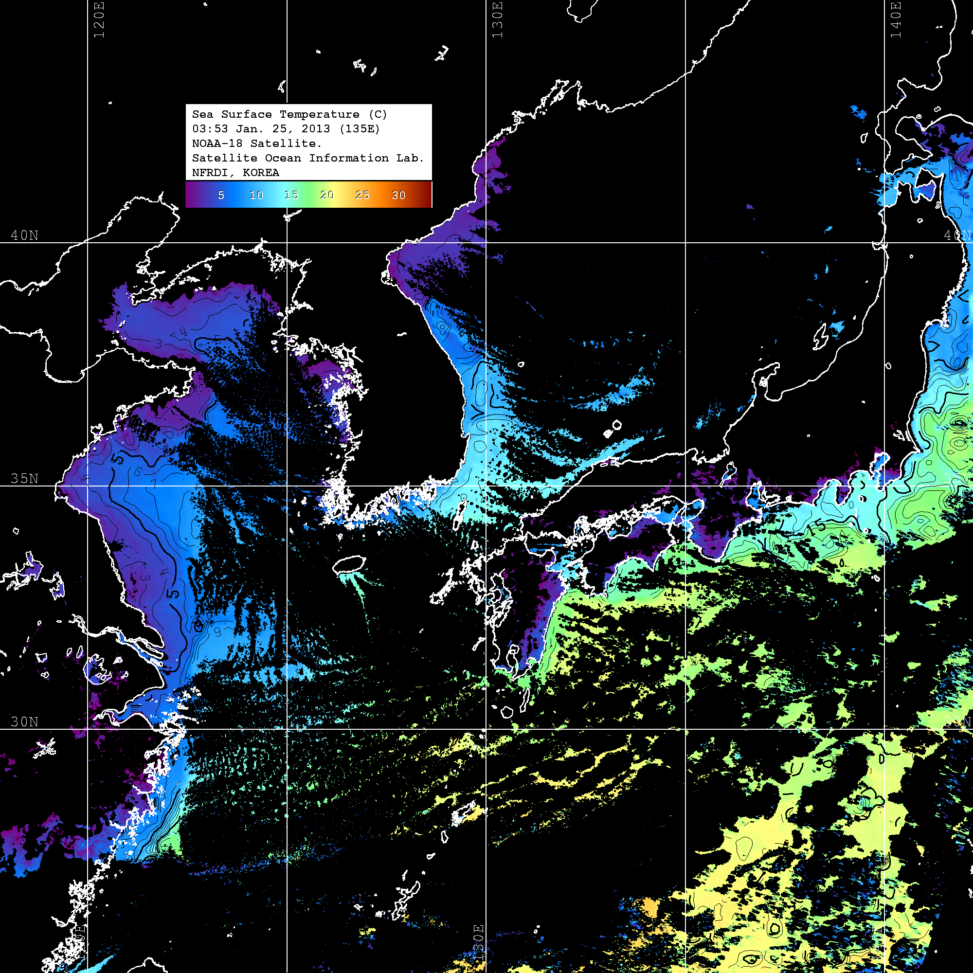 o 2013년 01월 25일 NOAA 위성영상입니다. o 영상 시간 및 수온분포는 범례를 참고하시기 바랍니다. o 검은색은 구름을 나타냅니다. o 그림을 클릭하시면 크게 보실 수 있습니다.