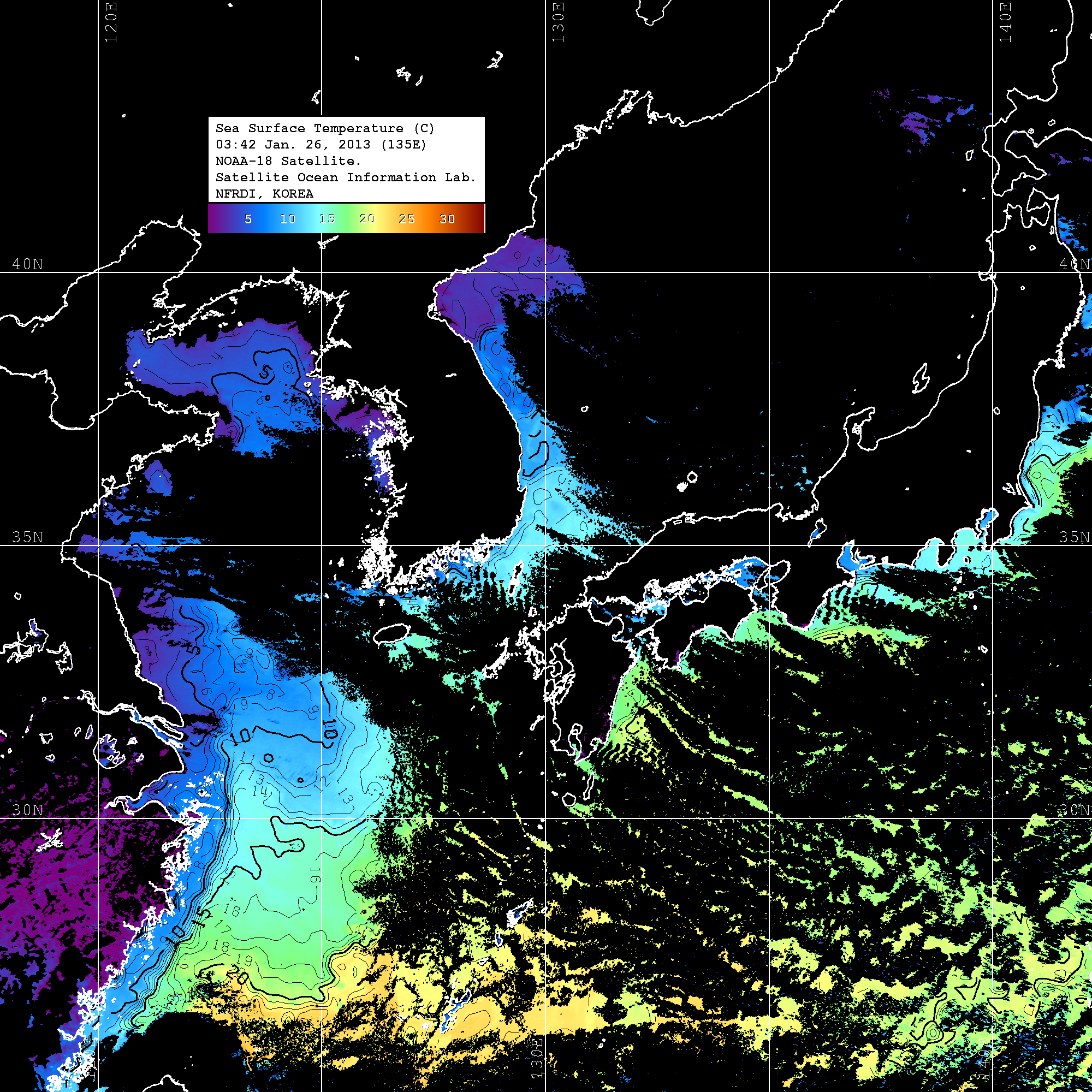 o 2013년 01월 26일 NOAA 위성영상입니다. o 영상 시간 및 수온분포는 범례를 참고하시기 바랍니다. o 검은색은 구름을 나타냅니다. o 그림을 클릭하시면 크게 보실 수 있습니다.