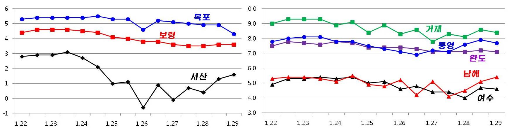 o 국립수산과학원의 실시간 관측을 통한 1월 22∼29일, 서해 3개소 (서산 가로림만, 보령 천수만 입구, 목포 죽교)와 남해 5개소 (완도 노화, 여수 신월, 남해 강진, 통영 사량, 거제 가배)의 자료 분석 결과, 수온 변동 경향은 아래와 같음. ? 수온은 서해 연안에서 -1∼6℃, 남해 연안 4∼10℃의 분포 범위를 보임. 25일부터 시작된 한파의 영향으로 일시적으로 낮아진 수온이 28일부터 회복되는 경향을 보임.